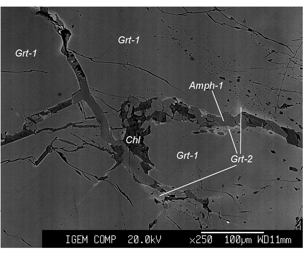 Рис. 3. Зональный гранат, гранат-цоизит-кварц-амфиболовых бластолитов. В центральной части зерен сохранился высокомагнезиальный гранат-1 эклогитовой ассоциации; по краям на контакте с амфиболом-1 в гранате формируется железистая зона граната-2.