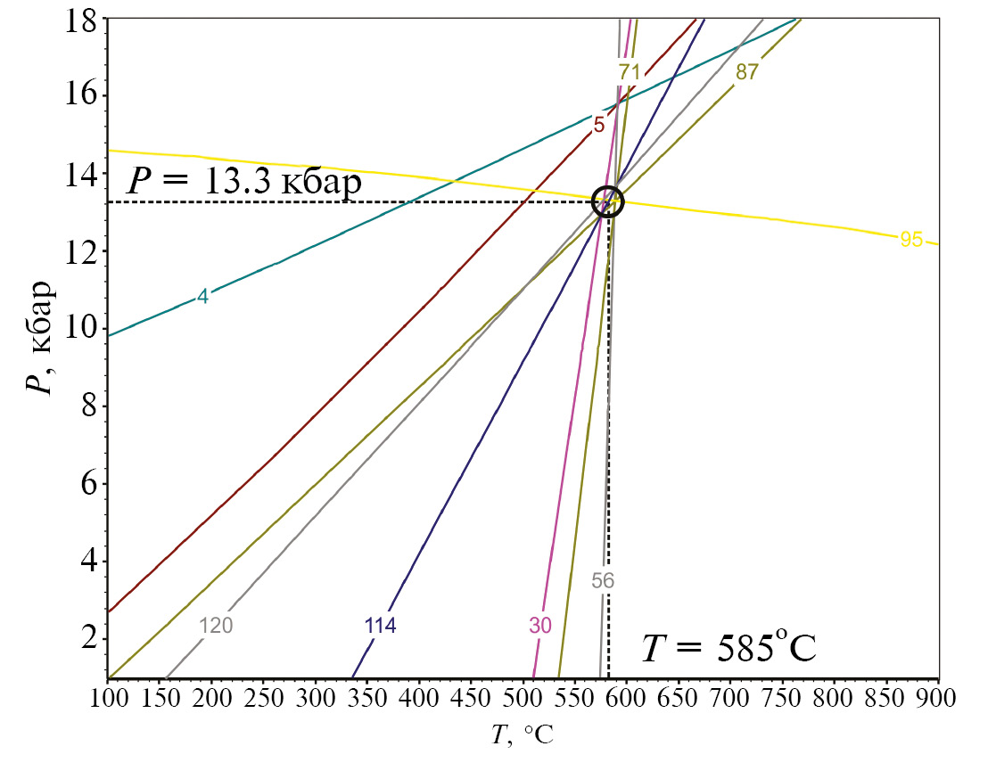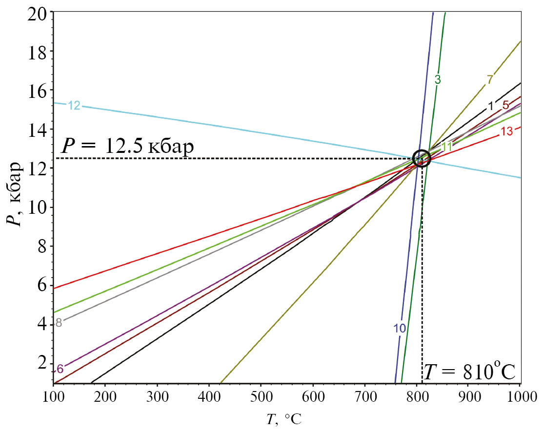 Линии мономинеральных равновесий гранат-биотитовой ассоциации, построенные по различным комбинациям составов граната, биотита и плагиоклаза показали хорошее схождение в локальной области, отвечающей интервалу Р = = 12.5–13.2 кбар и Т = 810–830 °C; наиболее типичная суперпозиция линий равновесий представлена на (рис. 8).