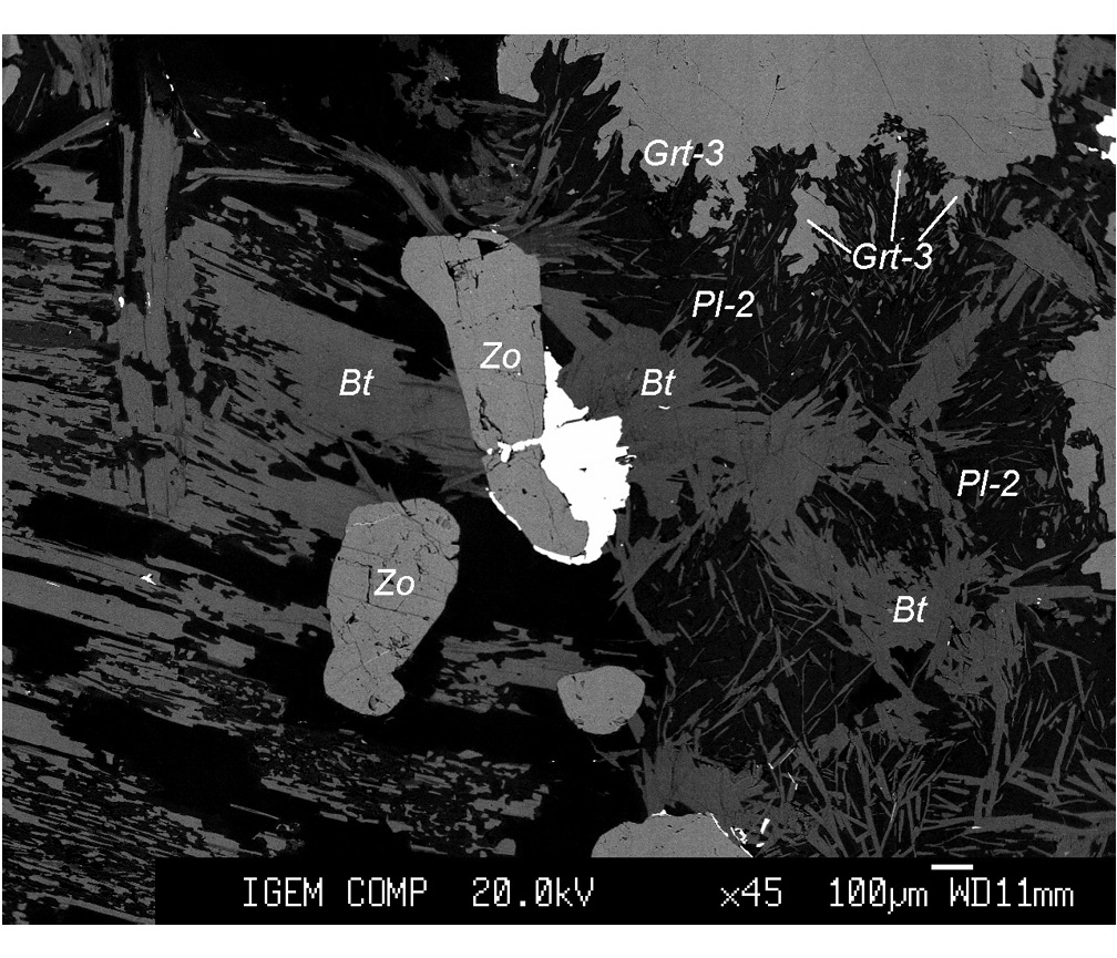 Рис. 7. Тонкопластинчатые “ельчатые” кристаллы биотита в совместных срастаниях с плагиоклазом-2. Гранат-3 – внешняя часть крупных зональных зерен граната-1 и 2, участвующая в биотит-плагиоклазовых срастаниях.