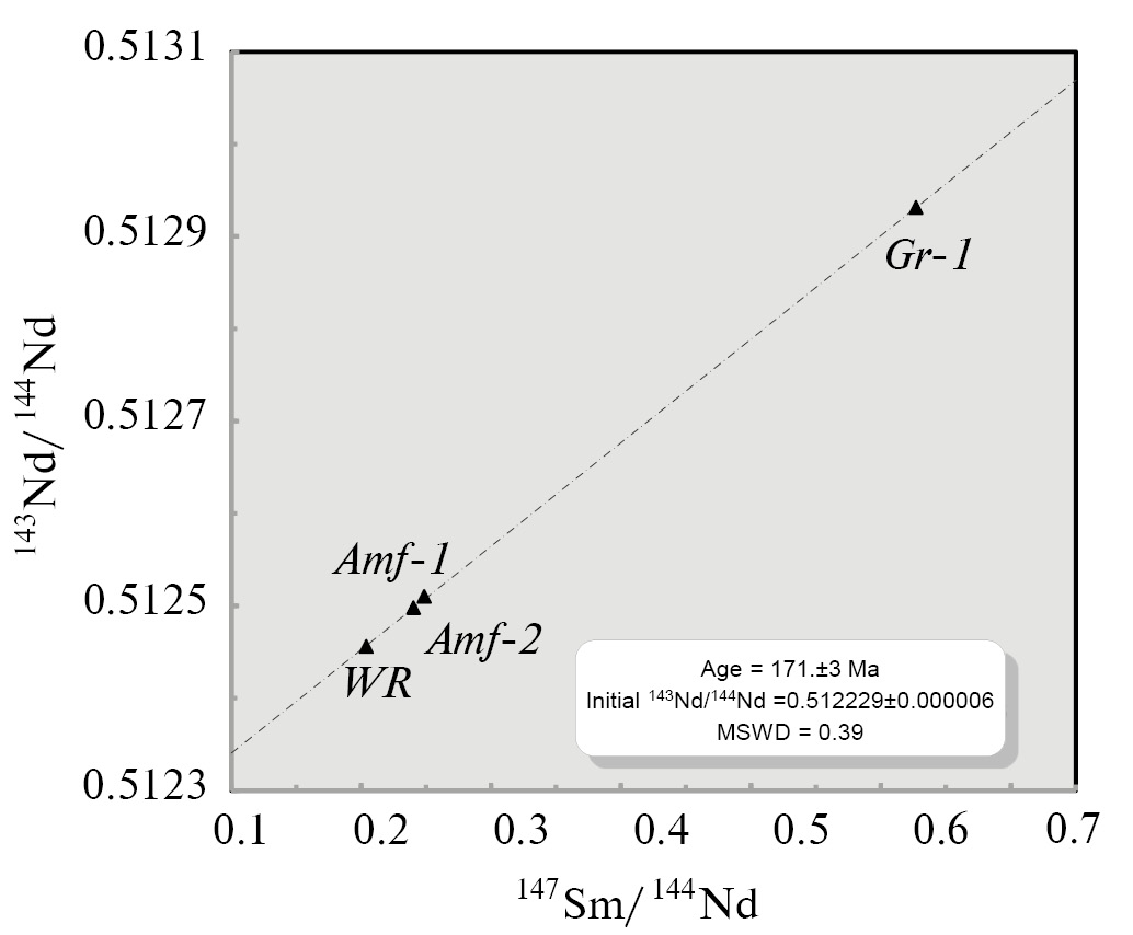 Полученные Sm-Nd изотопные данные позволили построить минеральную изохрону по 4 значениям: для породы, граната-1 (хорошо сохранившегося) и двум амфиболам (табл. 5). Построение изохроны и расчет возраста выполнены по программе Isoplot/Ех (Ludwig, 1999) Он составляет 171 ± 3 млн лет (рис. 9). Последний интерпретируется как возраст формирования главной минеральной ассоциации и соответствует ее кристаллизации на пике метаморфизма. Таким образом, результаты Sm-Nd изотопных исследований рассматриваемых бластолитов гонжинской серии позволяют выделить в формировании Гонжинского блока метаморфическое событие, отвечающее средней юре (171 ± ± 3 млн лет).