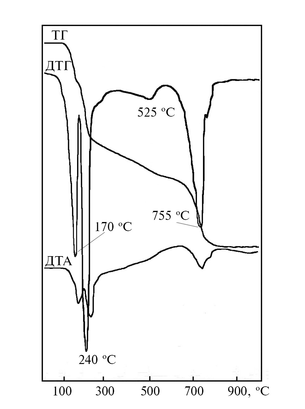 На кривой ДТА зафиксированы три эндотермических эффекта, связанные с процессами дегидратации, дегидроксилирования и десульфатизации и один протяженный экзотермический эффект в интервале около 500–700 °С, который можно отнести к кристаллизации фосфатов и сульфата железа.
