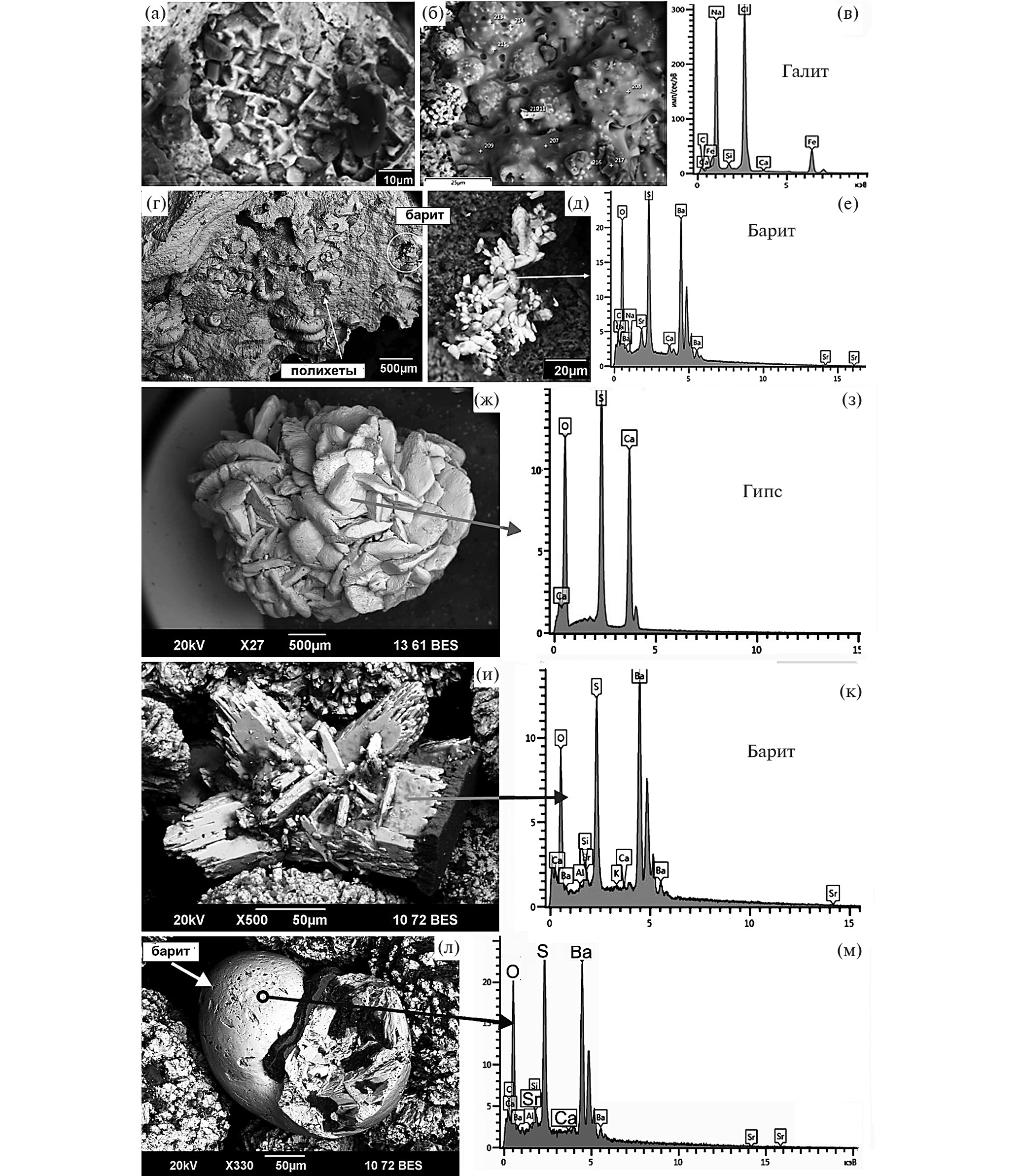 Рис. 2. СЭМ–изображение в режиме вторичных электронов (а, б, г, д): (а) – кристаллы галита в минерализованной биопленке; (б) – скопление фрамбоидов пирита в минерализованной биопленке с обилием NaCl; (в) – ЭПР-спектр минерализованной биопленки с хлоридом натрия; (г) – полихетовый известняк под карбонатной коркой из минибиогерма; (д) – агрегат баритовых зерен в трубочке червя-полихета; (е) – ЭДС-спектр агрегата из баритовых зерен; (ж–м) – аутигенные минералы из шлихового остатка легкой и тяжелой немагнитной фракции гипс-карбонатно-глинистого слоя, подстилающего мшанковые биогермные известняки: (ж) – мелкие гипсовые “розы”; (з) – ЭДС-спектр этого агрегата; (и) – кристаллы барита; (к) – ЭДС–спектр барита; (л) – фоссилия микрогастроподы с кристаллическим баритом в полости раковины; (м) – ЭДС-спектр барита со стронцием.