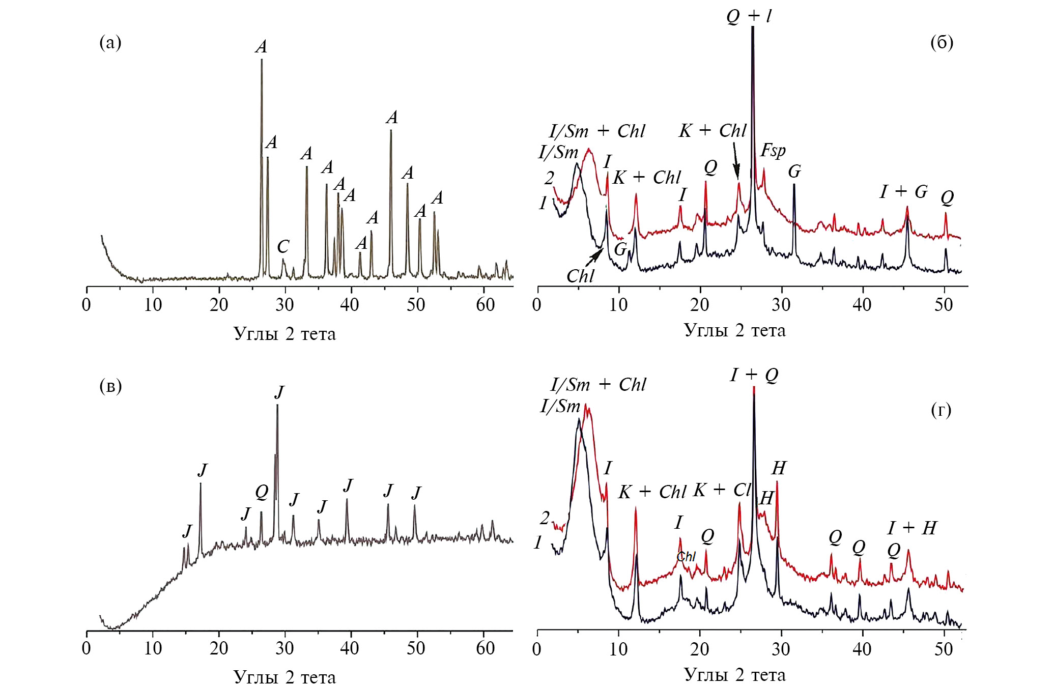 Рис. 5. Рентгеновские дифрактограммы: (а) – обр. Шар–9а–19, (б) – Шар–4–19, (в) – Шир-7–19, (г) – Шир-1–19. Условные обозначения: Q – кварц, C – кальцит, A – арагонит, Sm – смектит, Chl – хлорит, K – каолинит, I/S – иллит/смектит, I – иллит, J – ярозит, G – гипс, H – галит, Fsp – полевой шпат; 1 – воздушно-сухой образец, 2 – насыщенный этиленгликолем.