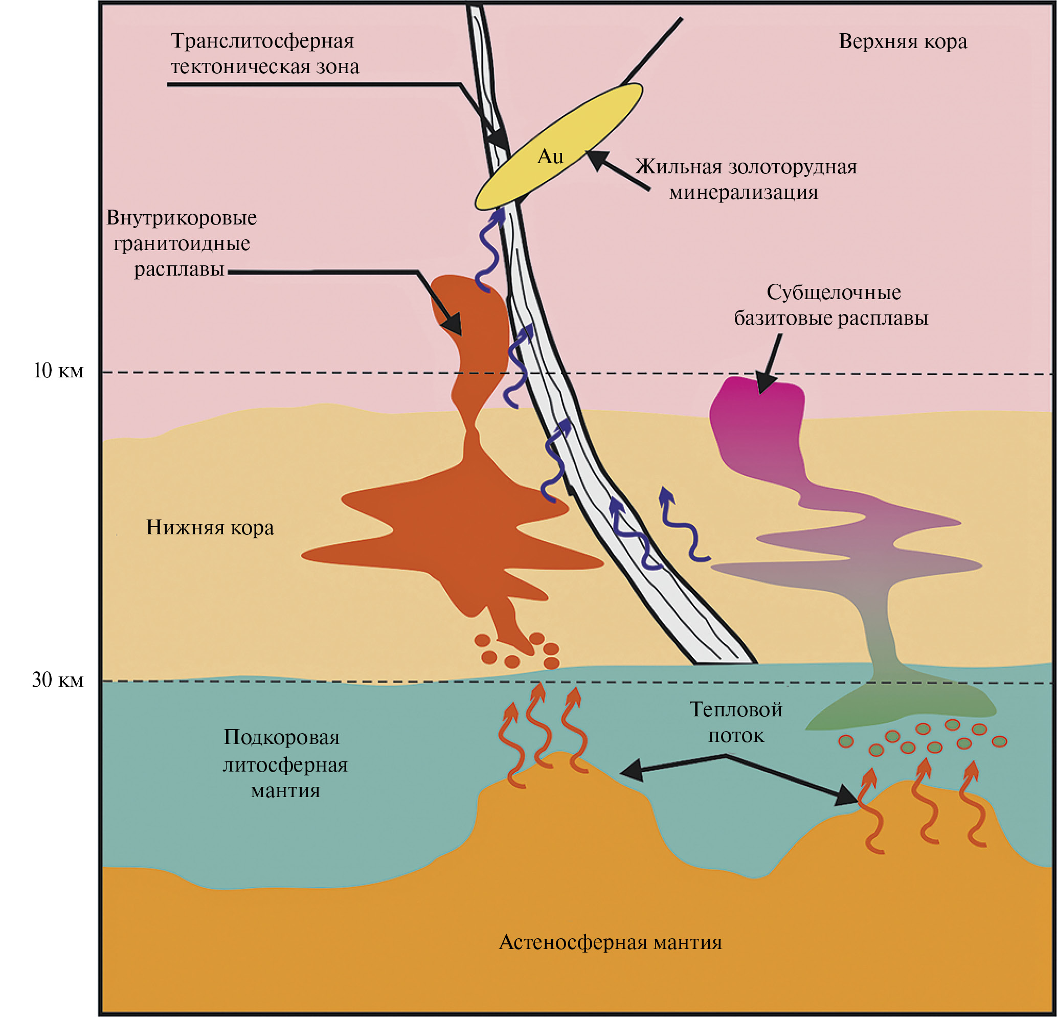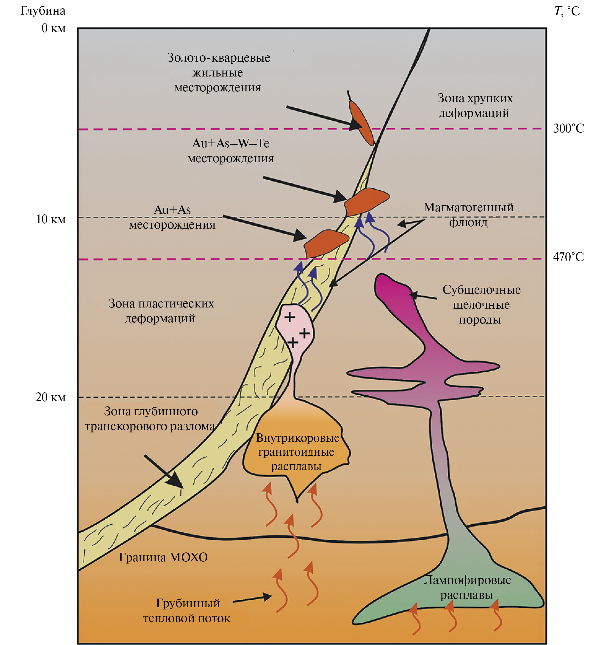 В отношении генезиса золоторудных месторождений орогенного типа в настоящее время разрабатывается две основные концепции: корового метаморфизма (crustal metamorphic model) и магматогенно-гидротермальная рудообразования (magmatic-hydrothermal model). Наиболее популярной из них является метаморфогенная концепция, которая наиболее полно изложена в работах (Tomkins, 2013a; Goldfarb, Groves, 2015; Groves et al., 2020). В соответствие с этой концепцией формирование мезотермальных месторождений золота орогенного типа связано с внутрикоровыми метаморфическими процессами, протекавшими на глубинах менее 20–25 км. В качестве главного источника как рудообразующих растворов, так и металлов, включая золото, рассматриваются супракристаллические породы (как правило, осадочного происхождения), дегидратация которых происходила при P-T условиях, отвечающих зеленосланцевой или амфиболитовой фациям метаморфизма (рис. 2). В качестве флюидоподводящих и рудоконтролирующих структур предполагаются транскоровые тектонические зоны и оперяющие их разломы.