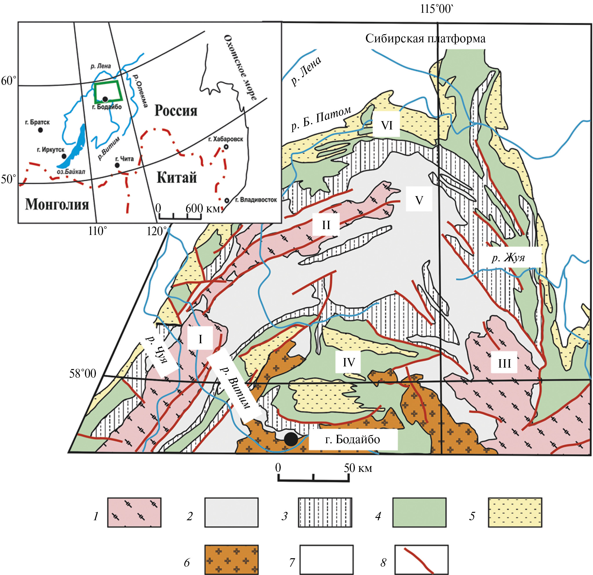 Рис. 5. Схема геологического строения центральной части Байкало-Патомского пояса (по Митрофанов и др., 1994 с изменениями): 1 — раннедокембрийские интрузивные и метаосадочные породы (без расчленения); 2–4 — неопротерозойские метаосадочные породы патомского комплекса и юдомской группы, серии (снизу вверх): 2 — баллаганахская, 3 — дальнетайгинская; 4 — жуинская; 5 — юдомская; 6 — палеозойские гранитоиды; 7 — фанерозойский осадочный чехол Сибирской платформы; 8 — тектонические нарушения.