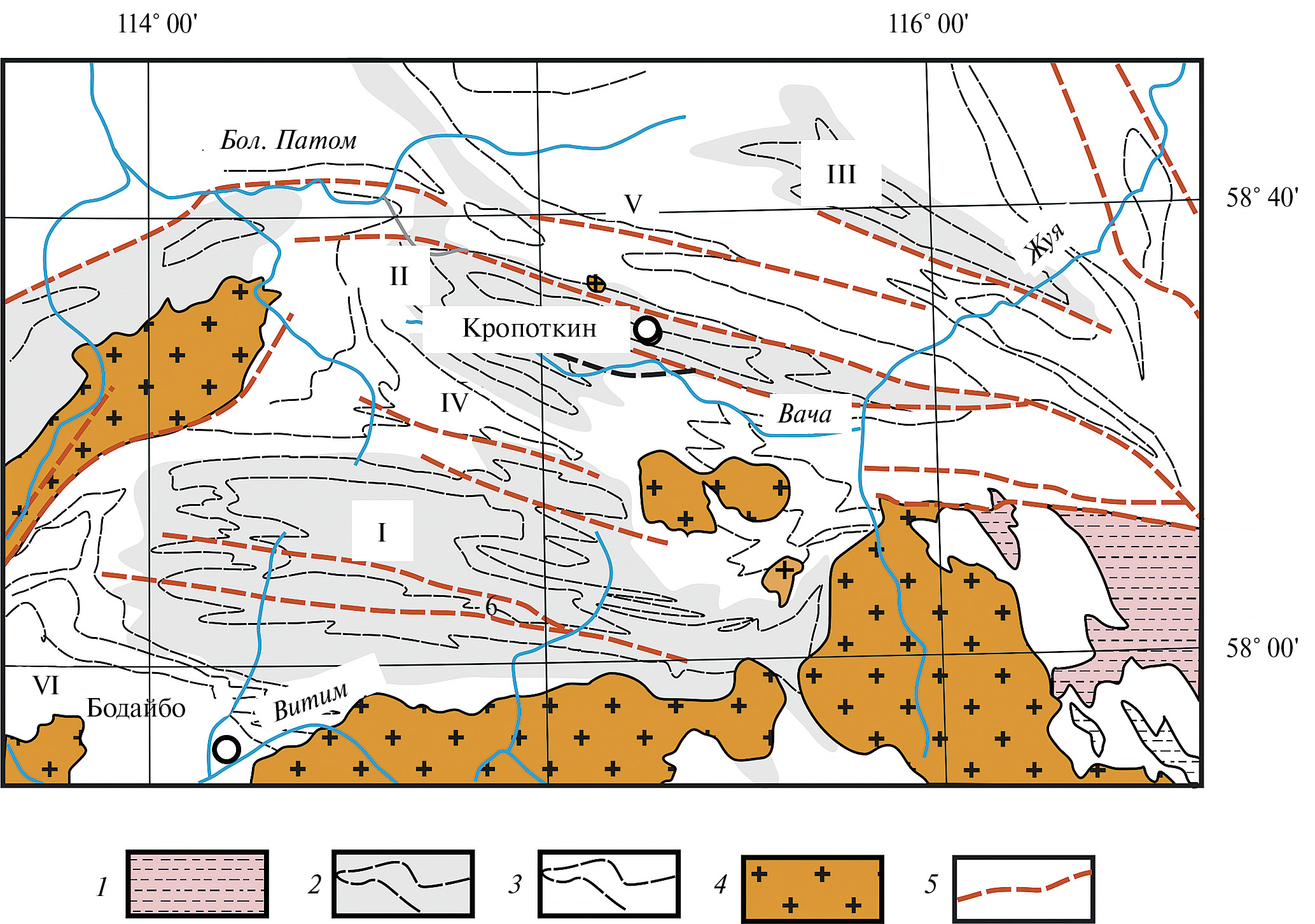 Рис. 7. Схема геологического строения Бодайбинской зоны Байкало-Патомского складчатого пояса по (Константинов, 2010а) с изменениями: 1 — палеопротерозойские метаосадочные породы нечерской и кевактинской серий (без расчленения); 2-3 — неопротерозойские терригенно-карбонатные породы патомского комплекса и бодайбинской серии, образующие структуры второго порядка: 2 — синклинальные прогибы (I — Бодайбинский, II — Маракано-Тунгусский, III — Хомолхино-Илигирский); 3 — антиклинальные поднятия (IV — Кропоткинское, V — Кадаликанское, VI — Тамаракское); 4 — палеозойские гранитоидные интрузивы; 5 — региональные тектонические нарушения.