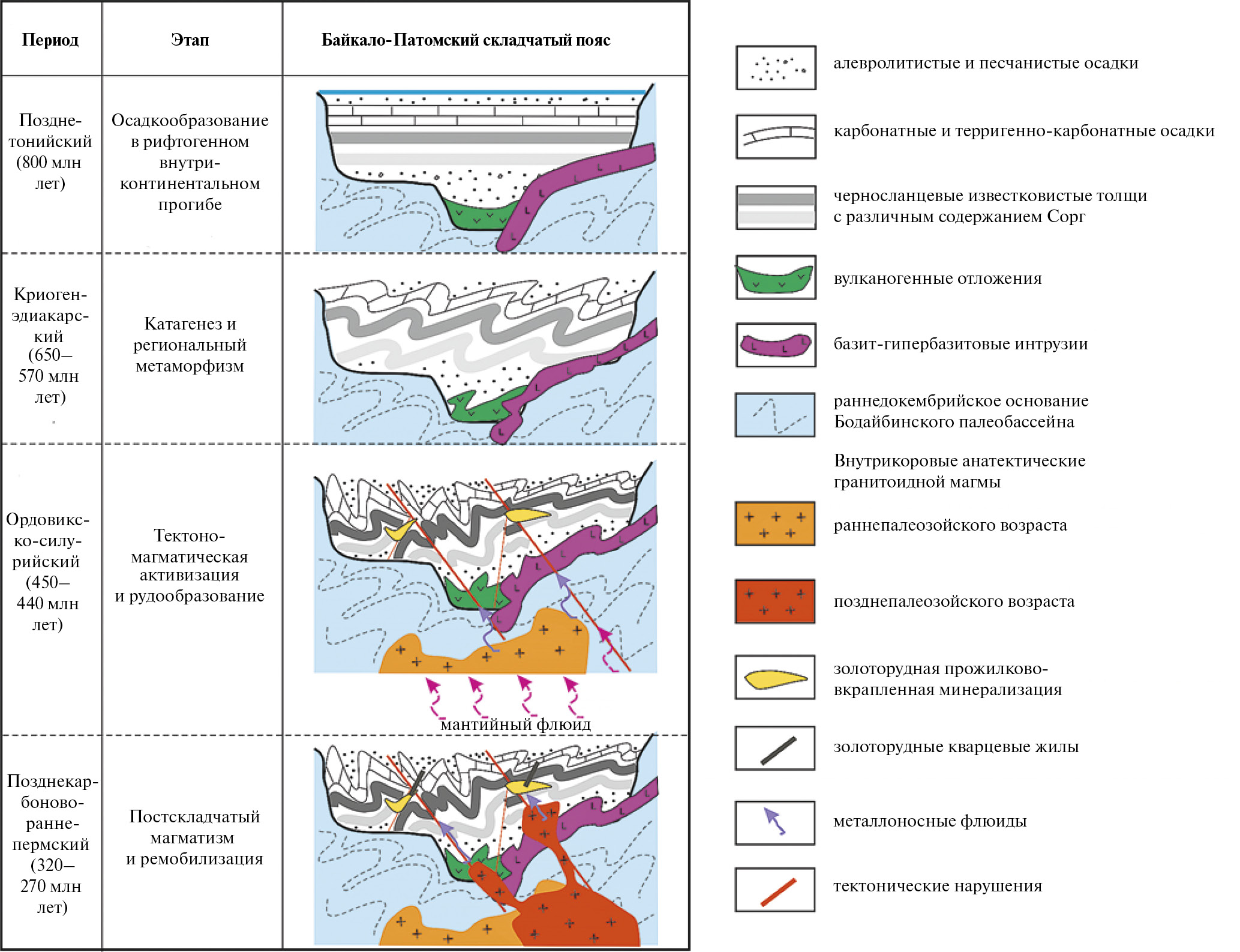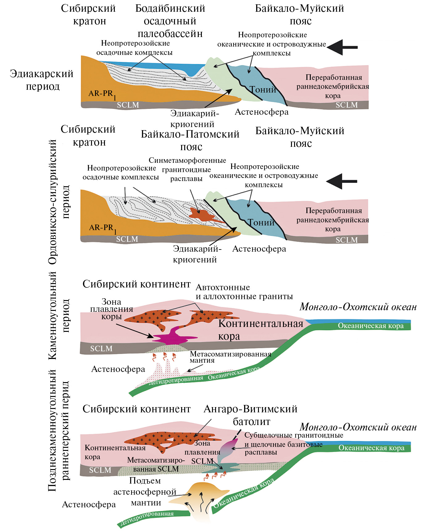В настоящее время не существует единой точки зрения среди исследователей на геотектоническое развитие структур южной окраины Сибирского континента, включая Байкало-Патомский и Байкало-Муйский складчатые пояса, в эдиакарско-палеозойское время (Зоненшайн и др., 1990; Zorin, 1999; Жмодик и др., 2006; Кузмин и др., 2006; Станевич и др., 2007, 2010; Зорин и др., 2009; Цыганков и др., 2010, 2017; Немеров и др., 2010; Litvinovsky et al., 2011; Гладкочуб и др., 2013; Donskaya et al., 2013; Yarmolyuk et al., 2014). Однако обобщение современных геологических и геохронологических данных, а также предложенных палеогеотектонических схем позволяет выделить несколько ключевых рубежей в истории эволюции региона в этот период.