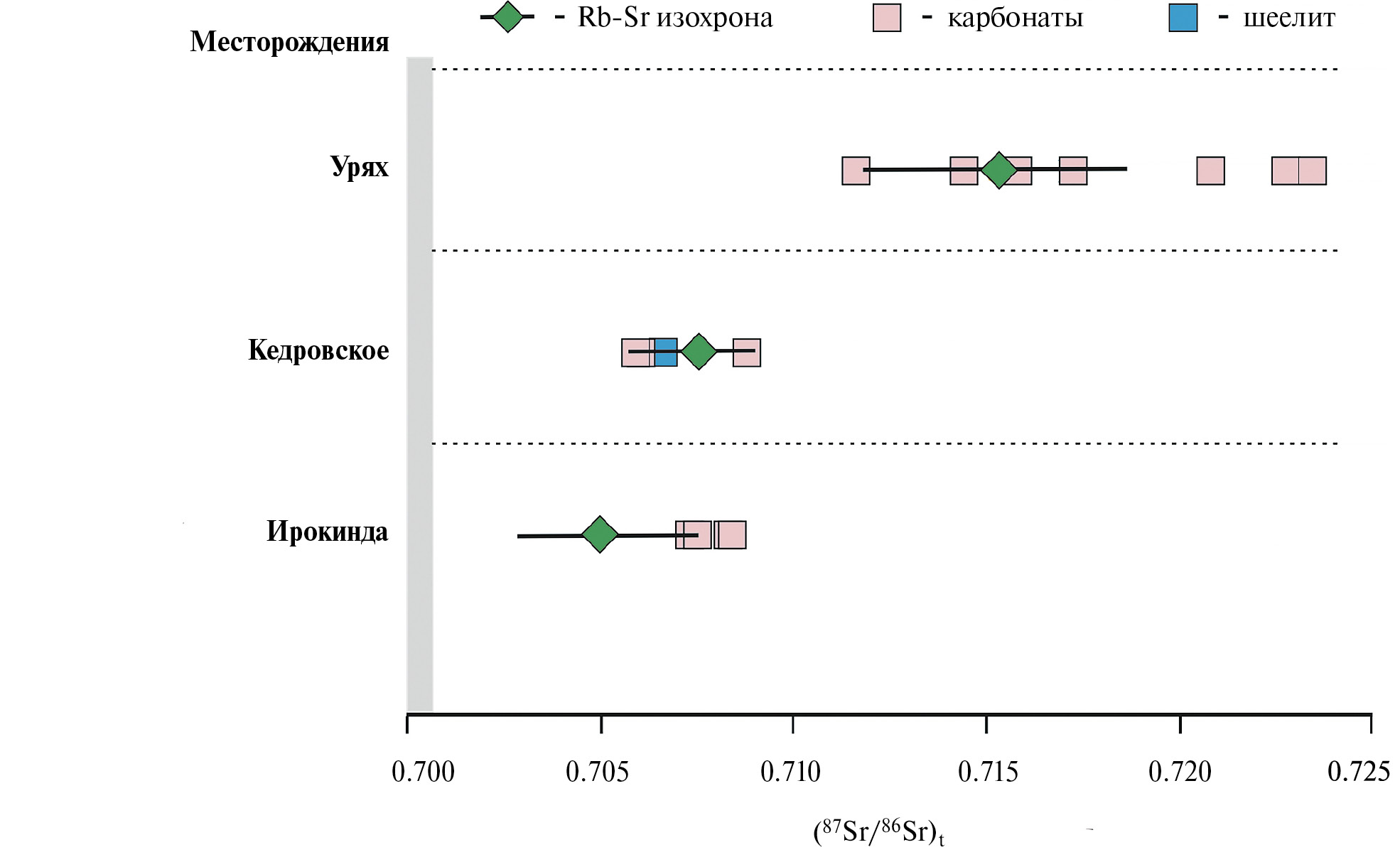 Isotopic-geochemical data (87Sr/86Sr, 143Nd/144Nd, Pb-Pb, and δ34S) indicate that the mesothermal ore-forming systems of the Northern Transbaikalia were heterogeneous in their isotopic characteristics, which distinguishes them from ore-magmatic (intrusion related type) systems. Comparison of Sr, Nd and Pb isotopic composition of ores and rocks of the region, including magmatic rocks of the same age as gold mineralization, proves the leading role of the Precambrian continental crust in the supply of mineral-forming components to the hydrothermal systems of gold deposits. The contribution of the magmatic source of matter in the genesis of orogenic gold mineralization was limited and is established only for the Early Permian ore-forming systems of the BMP, for which the input of metals from alkaline melts of basite composition is assumed.