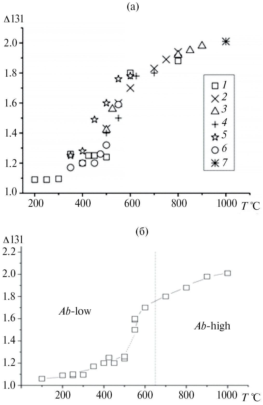 На рис. 2 приведена диаграмма состав плагиоклазов — параметр Δ131 (Cu-Kα1) для оценки температуры по степени упорядочения полевых шпатов. Для оценки температуры по величине Δ131 (Cu-Kα1) были использованы уравнения вида: