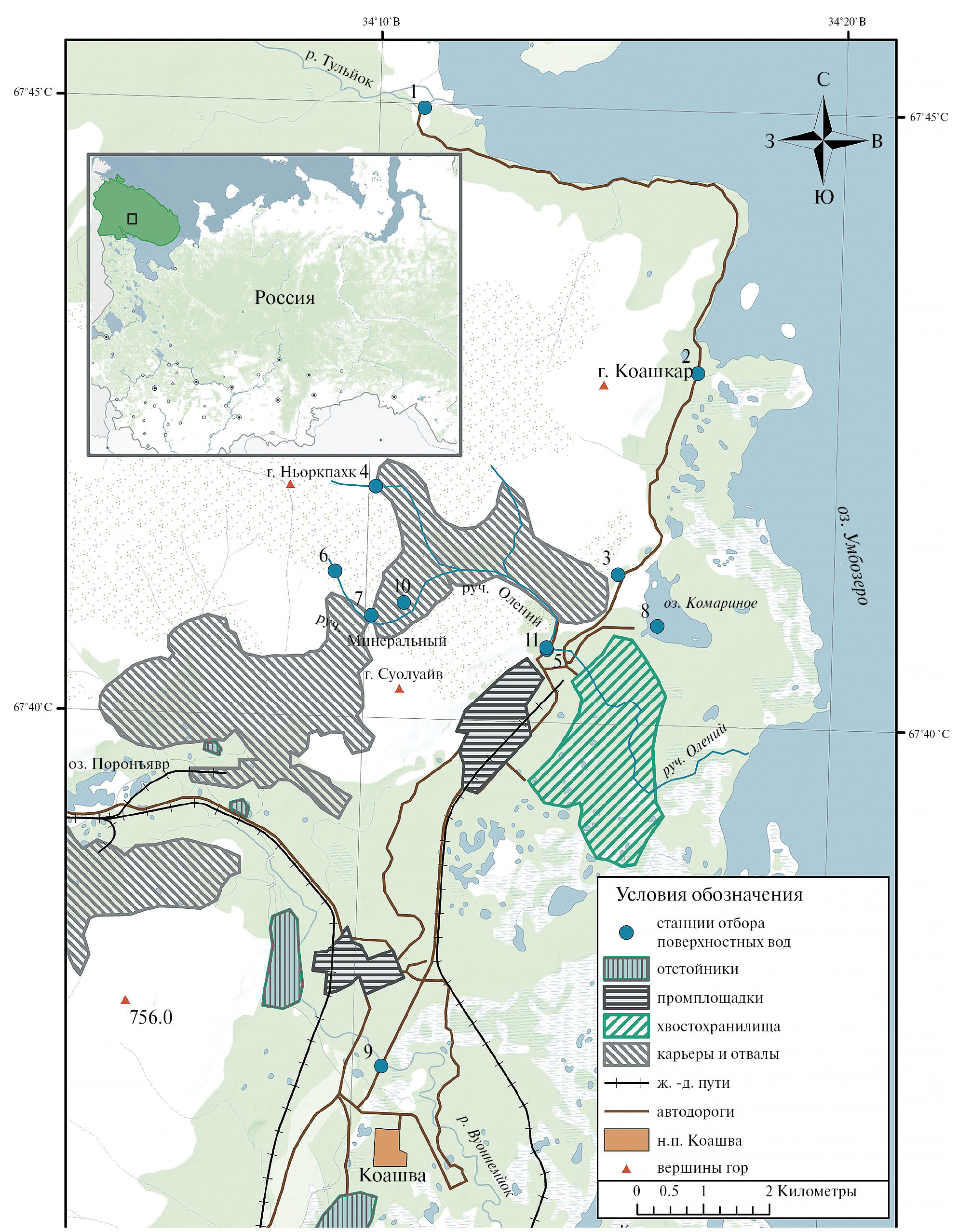 Данная статья продолжает представление результатов исследований химического состава природных вод в зоне влияния деятельности горнорудных предприятий, разрабатывающих крупнейшие в мире апатит-нефелиновые месторождения Хибинского щелочного массива, открытых в начале 20-х годов прошлого столетия академиком А.Е. Ферсманом (Кашулин и др., 2008; Dauvalter et al., 2020; Даувальтер, Даувальтер, 2020; Даувальтер и др., 2021, 2022б, 2023). Апатит-нефелиновые месторождения юго-западной части Хибин разрабатываются трестом “Апатит” с конца 1920-х годов. С 1978 г АО “Апатит” разрабатывает месторождения юго-восточной части Хибинского массива. Подробное описание геологического строения и истории освоения апатит-нефелиновых месторождений Хибинского щелочного массива приводится в ранее опубликованных работах (Ферсман, 1968; Яковенчук и др., 1999; Барабанов и др., 1999; Даувальтер и др., 2022в; 2023; Dauvalter et al., 2022). В статье впервые приводятся результаты проведенных в течение 2021 г. исследований химического состава ручьев и рек, в разной степени подверженных влиянию деятельности ГОК “Олений Ручей” АО “Северо-Западная Фосфорная Компания”, разрабатывающего одноименное апатит-нефелиновое месторождение с 2012 г. Проведенные исследования зафиксировали современные геохимические модификации природных вод в результате десятилетней деятельности нового горнорудного предприятия. Под геохимической модификацией в этой статье понимается преобразование химического состава поверхностных вод в зоне влияния деятельности горнорудного предприятия (атмосферных выбросов и стоков рудников, обогатительной фабрики и хвостохранилища) в результате растворения и выщелачивания горных пород и рудных минералов, извлекаемых на поверхность горного массива. Целью данных исследований является оценка степени воздействия нового горнорудного предприятия на поверхностные воды и сопоставление его воздействия на окружающую среду с предприятиями, имеющими почти вековую историю.