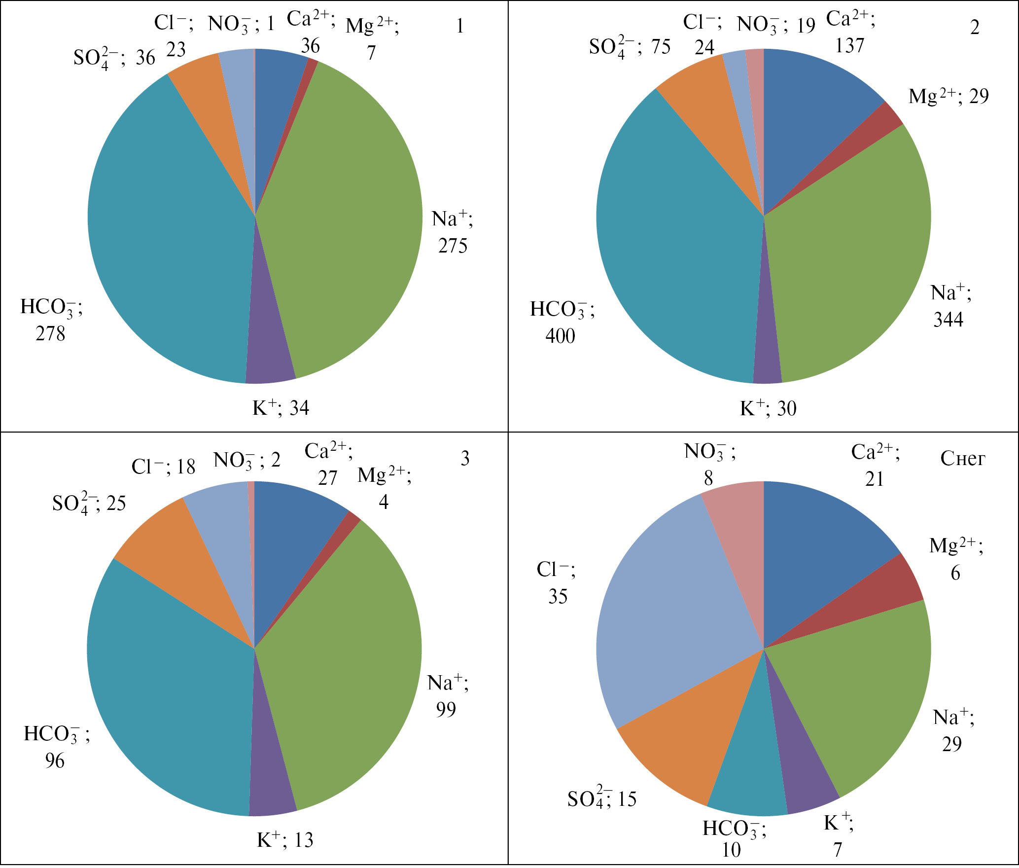 Рис. 2. Эквивалентные концентрации (мкг-экв/л) главных ионов в воде р. Тульйок (1), ручьев Теплый (2) и Нагорный (3) и среднее содержание в снеге (Снег) по всей исследуемой территории (Даувальтер и др., 2023).