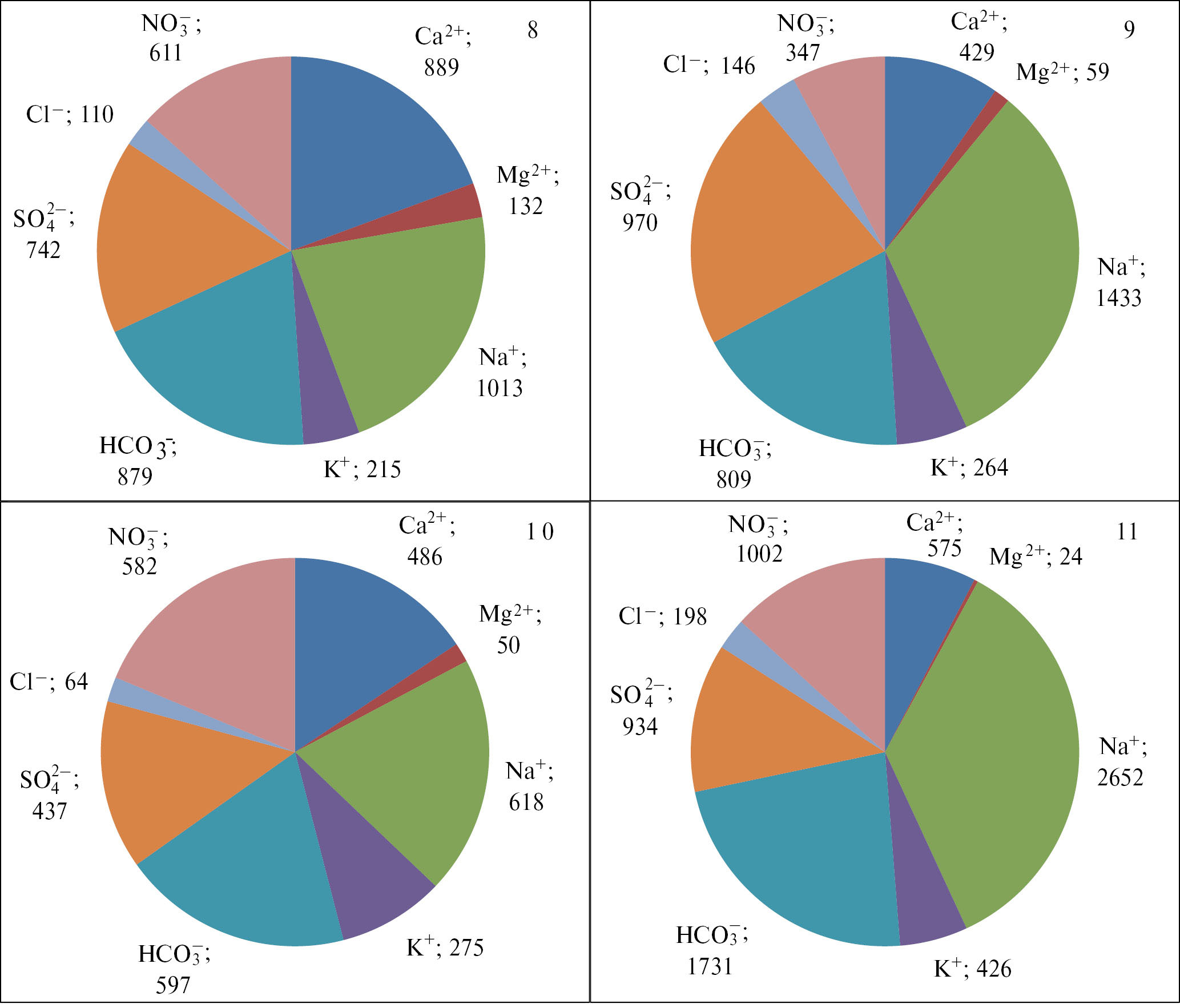 Рис. 4. Эквивалентные концентрации (мкг-экв/л) главных ионов в воде оз. Комариное (8), р. Вуоннемйок (9), сточных вод из карьера (10) и подземного рудника (11) ГОК “Олений Ручей”.
