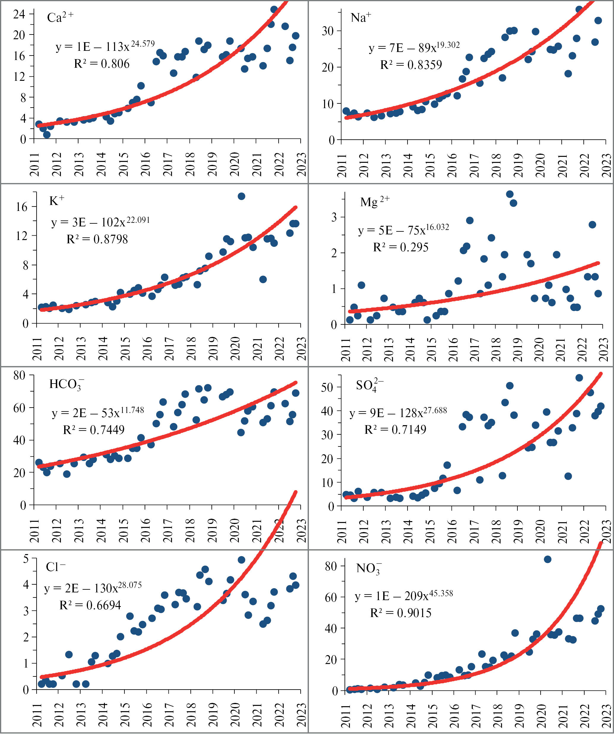 Содержание нитрат-иона NO3– в воде оз. Комариное за период деятельности ГОК “Олений Ручей” выросло в степенной прогрессии, как и главных ионов, достигая иногда величины предельно допустимой концентрации для воды рыбохозяйственных водоемов ПДКрбх — 40 мг/л (рис. 5). За последние 3–4 года содержание NO3– в воде озера несколько стабилизировалось и находится в пределах 25–45 мг/л, что, возможно, говорит о том, что содержание соединений азотной группы пришло в некоторое равновесие в последние годы, как и величина pH и минерализация воды.