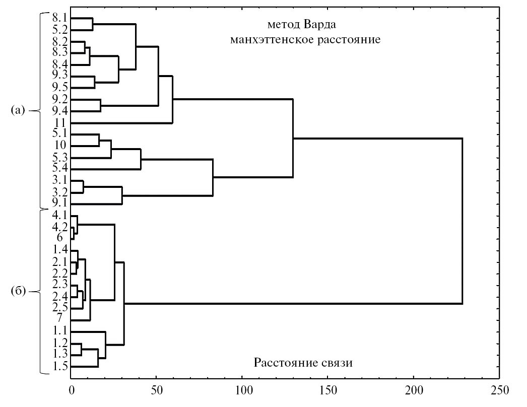 Для классификации исследованных станций по химическому составу вод, а также для выявления связей между показателями был использован иерархический кластерный анализ (Romesburg, 1984), традиционно применяемый для интерпретации результатов геохимических исследований (Banda et al., 2023; Даувальтер и др., 2023). Кластеризация была произведена методом Варда (Ward, 1963) после выполнения стандартизации данных (x̅ = 0; σ = 0); мерой сходства послужило манхэттенское расстояние (Krause, 1973). Для анализа были использованы все полученные данные о химическом составе вод (30 показателей в 31 пробе воды) с учетом сезонных изменений. Верификация выделенных кластеров была осуществлена посредством итеративной процедуры к-средних Маккуина, локализующей сгущения в многомерном пространстве из анализируемых признаков (MacQueen, 1965). Значимость различий между полученными кластерами определяли с помощью однофакторного дисперсионного анализа (ANOVA), при этом для каждого кластера были вычислены основные описательные статистики (Lloyd, 1982).