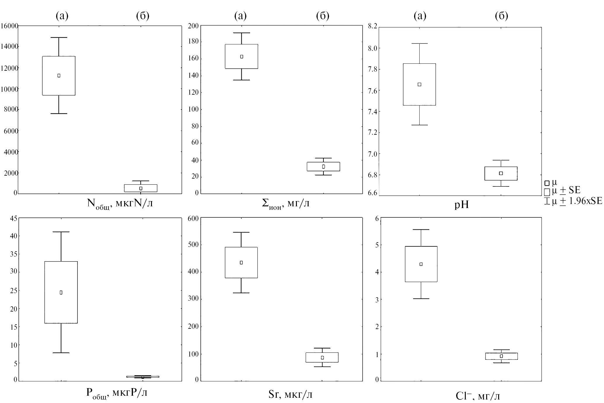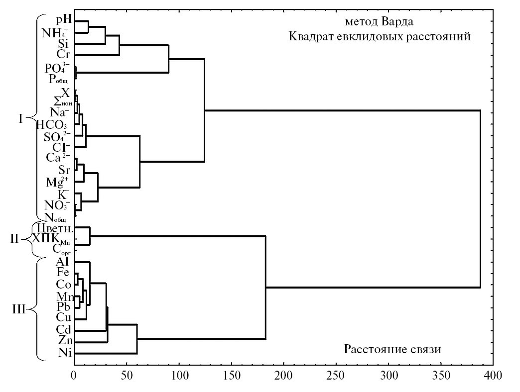 Иерархический кластерный анализ позволил выделить три группы показателей с однородными значениями. Первая группа включает показатели, в основном формирующие химический состав вод в зоне влияния апатитового производства — соединения фосфора и азота, величину pH, минерализацию и концентрацию главных ионов, а также Sr и Si. Во вторую группу вошли органические соединения и зависящая от их присутствия цветность воды. Третья группа представлена металлами, поступающими в водные объекты после выщелачивания силикатов, алюмосиликатов и сульфидов, входящих в состав апатит-нефелиновой руды и контактирующих с ними горных пород.