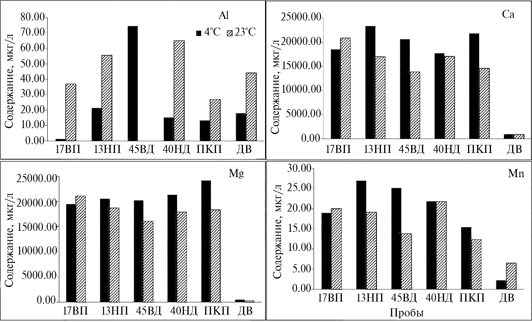 Рис. 1. Влияние температуры оттаивания (4 °C, 23 °C) и биогенного фактора на особенности выщелачивания петрогенных элементов в присутствии гумата натрия. Обозначения проб: 17 ВП, 13 НП, 45 ВД, 40 НД — штаммы микроорганизмов; ПКП — природный консорциум нестерильной породы; ДВ — деионизированная вода.