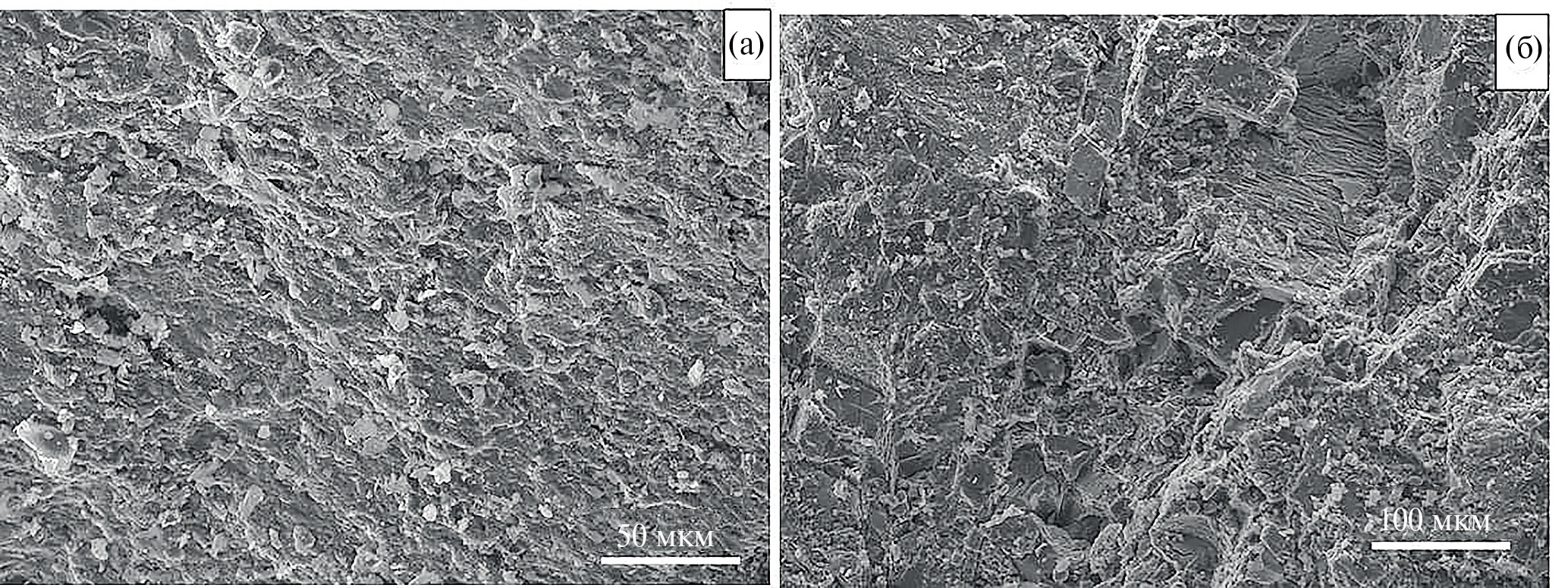 Рис. 3. СЭМ изображение поверхности образцов сухой породы после циклического замерзания (–18 °C) и оттаивания при разной температуре: а — 4 °C; б — 23 °C.