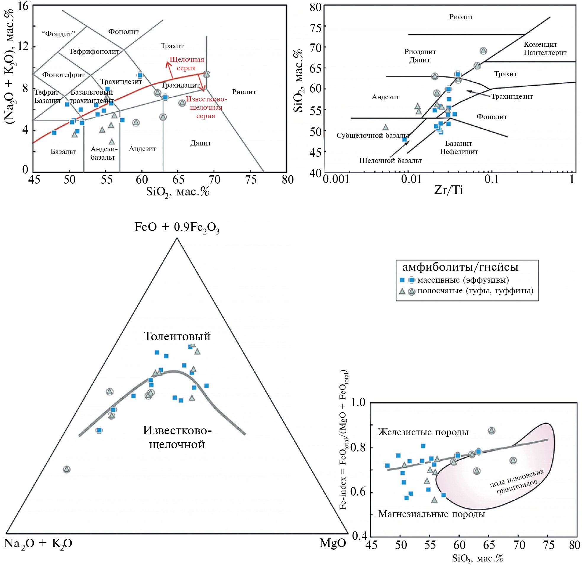 Рис. 4. Классификационные петрохимические диаграммы для метавулканических пород донской серии: SiO2–(Na2O + K2O) (LeBas et al., 1986), Zr/Ti–SiO2 (Winchester, Floyd, 1977), AFM (Irvine, Barragar, 1971) и SiO2–Fe-index (Frost, Frost, 2008).