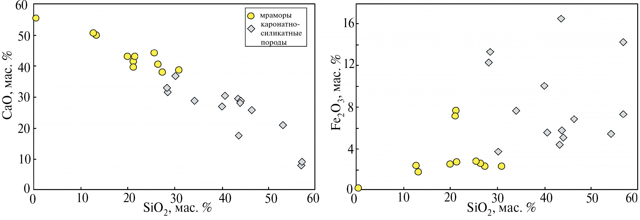 Мраморы и карбонатно-силикатные породы донской серии демонстрируют изменчивые концентрации главных элементов (табл. 1, рис. 6). Среди обогащенных карбонатом пород чистые мраморы отсутствуют, поэтому наряду с высокими содержаниями CaO (38–49 %) и потерь при прокаливании (18–28 %) в них обнаруживаются высокие концентрации кремнезема (до 31 %) и других оксидов: Al2O3 (3.3–4.5 %), Fe2O3 (1.8–7.6 %), MgO (0.6–2.6 %). Карбонатно-силикатные породы по сравнению с мраморами содержат меньше CaO (7.9–36.8 %) и потерь при прокаливании (1–17 %), более высокие концентрации кремнезема (до 57 %) и других оксидов: Al2O3 (3.9–14.2 %), Fe2O3 (5.1–13.3 %), MgO (до 4.8 %). По pаcпpеделению PЗЭ обе группы пород похожи (pиc. 5), они имеют сильно наклонные графики, отрицательные евpопиевые аномалии (Eu/Eu* = 0.67–0.96), что сближает их с палеопротерозойскими и неоархейскими граувакками (Condie, 1993). От PAAS мраморы и карбонатно-силикатные породы донской серии отличаются меньшей суммой РЗЭ. Отношение (La/Yb)N изменяется в интервале 8.0–11.6, сумма РЗЭ 57–75 ppm, что сопоставимо с суммой РЗЭ в верхней континентальной коре (ВКК). По содержаниям LILE и HFSE карбонатные породы близки к верхней континентальной коре (ВКК) (рис. 5), однако деплетированы Th и Ti в мраморах и обогащены Sr в обоих типах пород.