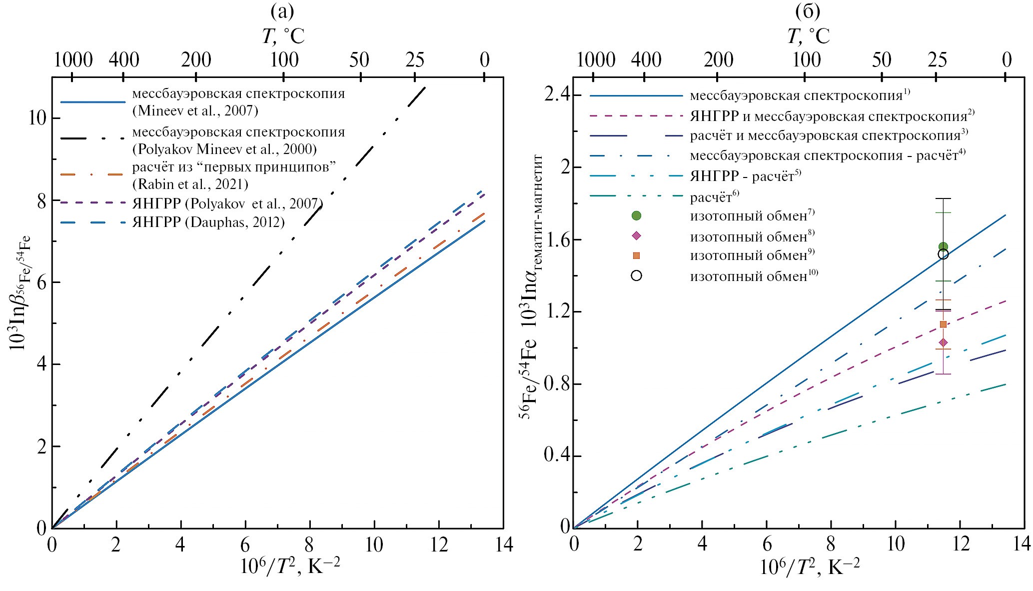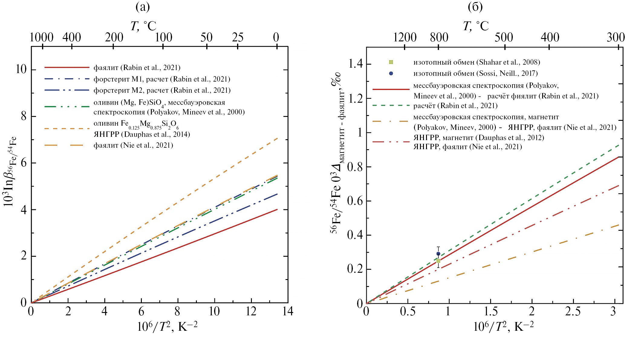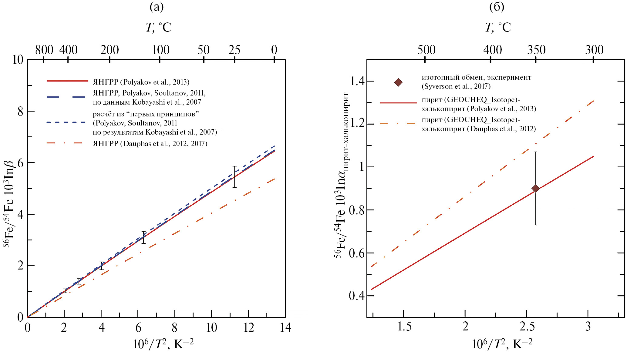 Также, как и в случае углеродных и кислородных изотопных эффектов (Mironenko et al., 2018; Поляков и др., 2021), точность и обоснованность расчетов по изотопным равновесиям с участием железа определяется точностью данных по β-факторам железа для минералов, которые используются в программном комплексе GEOCHEQ_Isotope. Для оценки равновесных изотопных факторов фракционирования изотопов железа применяют как теоретические, так и экспериментальные методы. Теоретические расчеты β-факторов железа в подавляющем большинстве проводятся из “первых принципов” на основе метода функционала плотности (Schauble, 2004; Blanchard et al., 2009, 2017; Rustad et al., 2010; Fujii et al., 2014; Johnson et al., 2020). Экспериментальные определения равновесных коэффициентов разделения изотопов железа используют предложенный Нортропом-Клейтоном (Northrop, Clayton, 1966) метод частичного изотопного обмена и впервые использованный Matsuhisa et al. (1978) трехизотопный метод (Welch et al., 2003; Wiesli et al., 2004; Schuessler et al., 2007; Shahar et al., 2008; Syverson et al., 2013; Frierdich et al., 2014a,b; Pokrovski et al., 2021). При этом трехизотопный метод измерения для железа является наиболее распространенным.