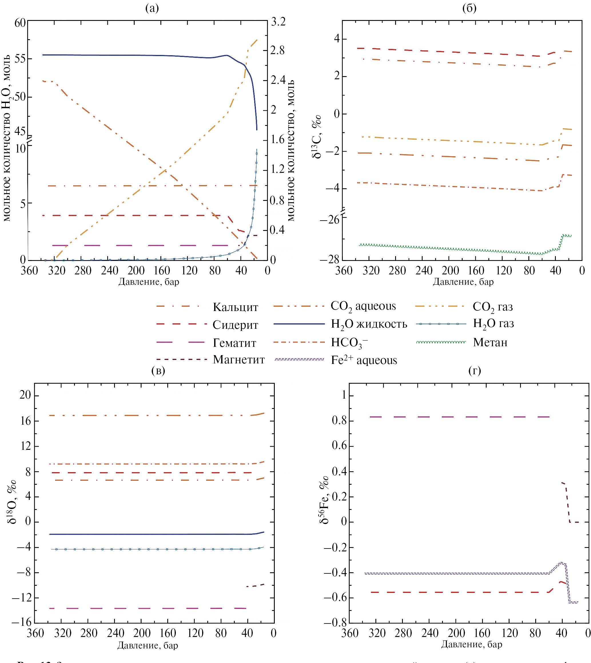 Общий подход к расчету химических и изотопных равновесий с участием железа, аналогичен тому, который был использован нами при расчете равновесий с участием кислорода и углерода (Mironenko et al., 2018; Поляков и др., 2021). Этот подход, идея которого принадлежит Б.Н. Рыженко, названный методом изотопно-химической системы, восходит к работам Д.В. Гричука с соавторами по совместному расчету химических и изотопных равновесий, включающему серосодержащие соединения (Банникова и др., 1987; Гричук, 1987, 1988, 2000; Гричук, Леин, 1991). Этот подход дает возможность проводить расчет изотопных и химических равновесий в один этап, в то время как в рамках обычных подходов (Ohmoto, 1972), сначала проводят расчет химических равновесий, а затем рассчитывают изотопные составы химических соединений. Преимущество совместного расчета изотопных и химических равновесий наиболее ярко проявляется при расчетах процессов, представляющих последовательность равновесных состояний, сопровождающихся потерей и/или привносом вещества, поскольку в этом случае изотопный масс-баланс, выполняется автоматически (Мироненко и др., 2021).