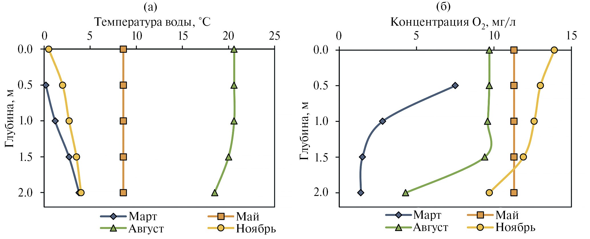 Рис. 2. Вертикальное распределение (а) – температуры воды и (б) – растворенного кислорода в разные сезоны года.