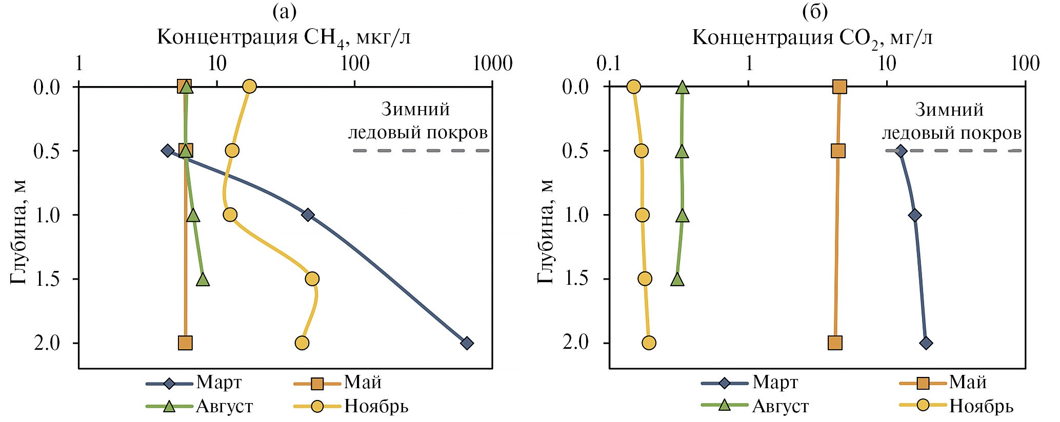 Концентрации ПГ в марте (рис. 3а, б) составили 4–652 мкг/л СН4 и 12–19 мг/л СО2. В вертикальном распределении высокие значения концентраций обоих газов отмечены ниже 1 м, и достигают максимума в придонном горизонте. Ледовый покров, устанавливающийся на озерах в зимний период, препятствует газообмену между водоемом и атмосферой, что ведет к накоплению в толще воды растворенных газов, а низкая температура воды способствует их растворимости. Концентрации метана в подледном горизонте мало отличаются от значений в период открытой воды, а с глубиной повышаются и достигают максимальных значений в придонном горизонте. Концентрации углекислого газа по всему профилю в зимний период, в целом, значительно превышают значения, полученные в остальные сезоны (от 3 раз по сравнению с майскими концентрациями, до 100 раз по сравнению со значениями в ноябре). Подобная динамика концентраций CO2 отмечается в работе (Kortelainen et al., 2006) где приведены результаты исследований 209 бореальных озер Финляндии. В исследованных озерах также наблюдались максимальные концентрации СО2 в подледный период и их снижение в периоды весенней и осенней гомотермии, с увеличением в гиполимнионе в период летней стратификации.