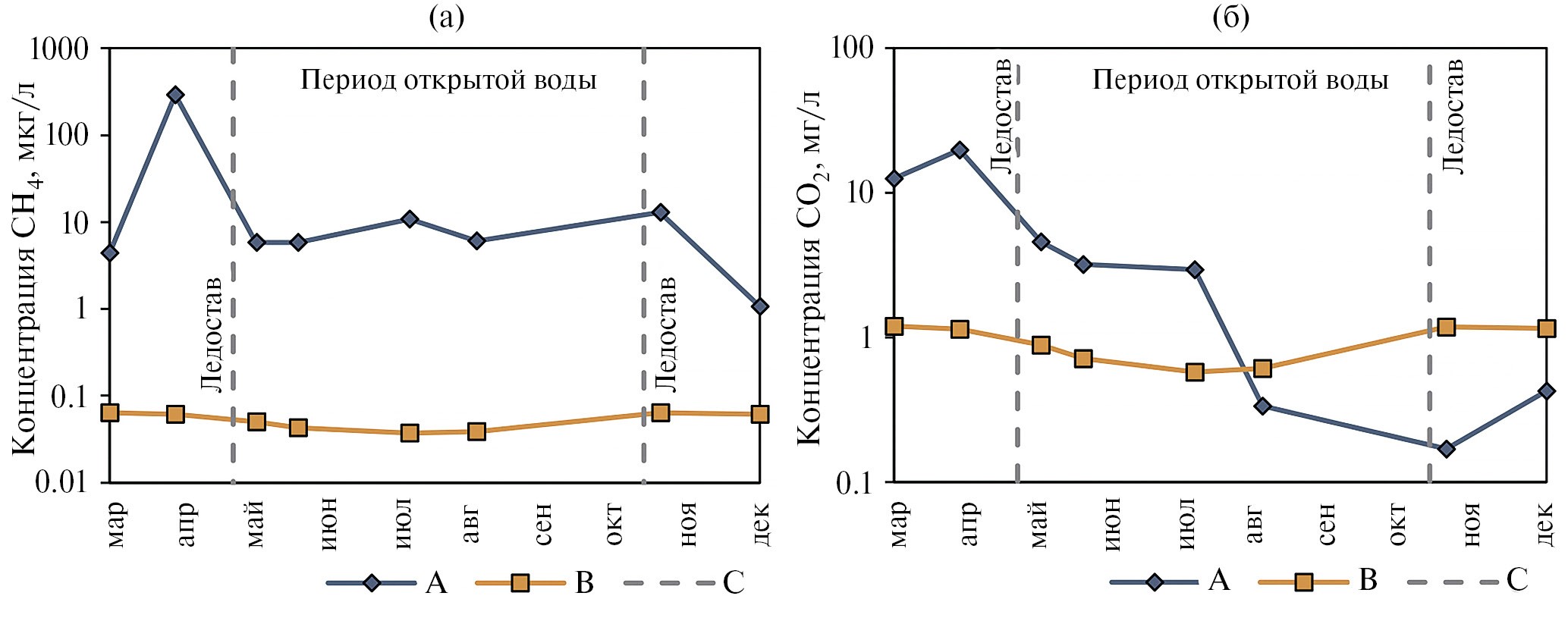 Рис. 4. Сезонный ход (а) – поверхностных концентраций CH4 и (б) – поверхностных концентраций CO2. A – фактические измеренные концентрации; B – равновесные с атмосферой; C – границы периодов открытой воды и устойчивого ледового покрова.