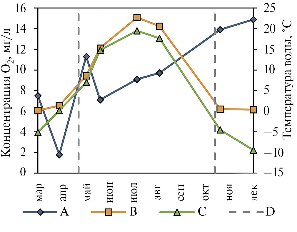 Рис. 5. Сезонный ход A – концентраций растворенного O2, B – температуры поверхностного слоя воды и C – средней месячной температуры воздуха по М-2 Холмогоры; D – границы периодов открытой воды и устойчивого ледового покрова.