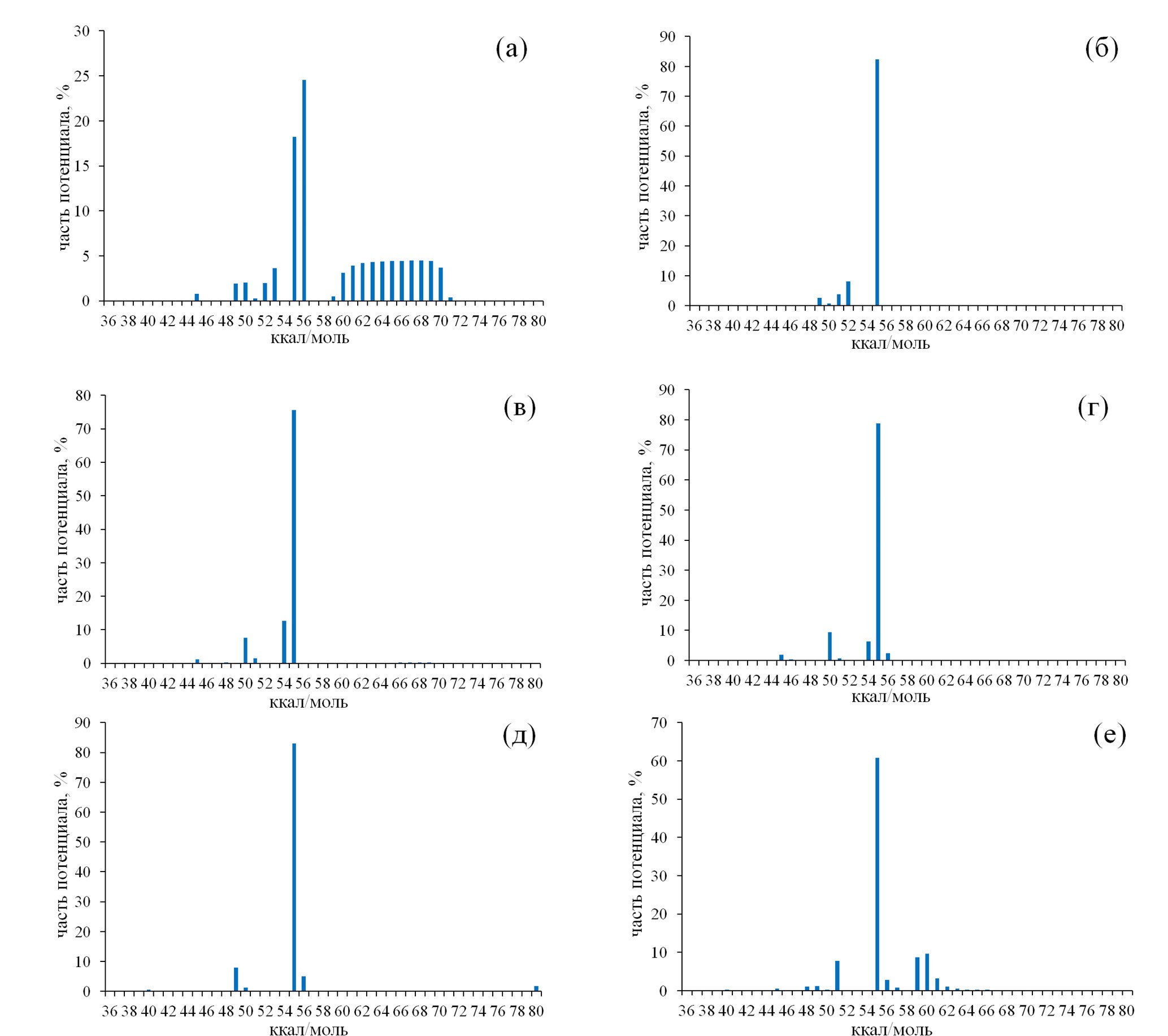 Рис. 2. Распределение энергий активации образования углеводородных газов в гидротермальном эксперименте. Где а-е: а — метан, б — этан, в – пропан+пропилен, г — н-бутан, д — н-пентан, е — сумма предельных и непредельных газов состава С1-С5 без пентенов
