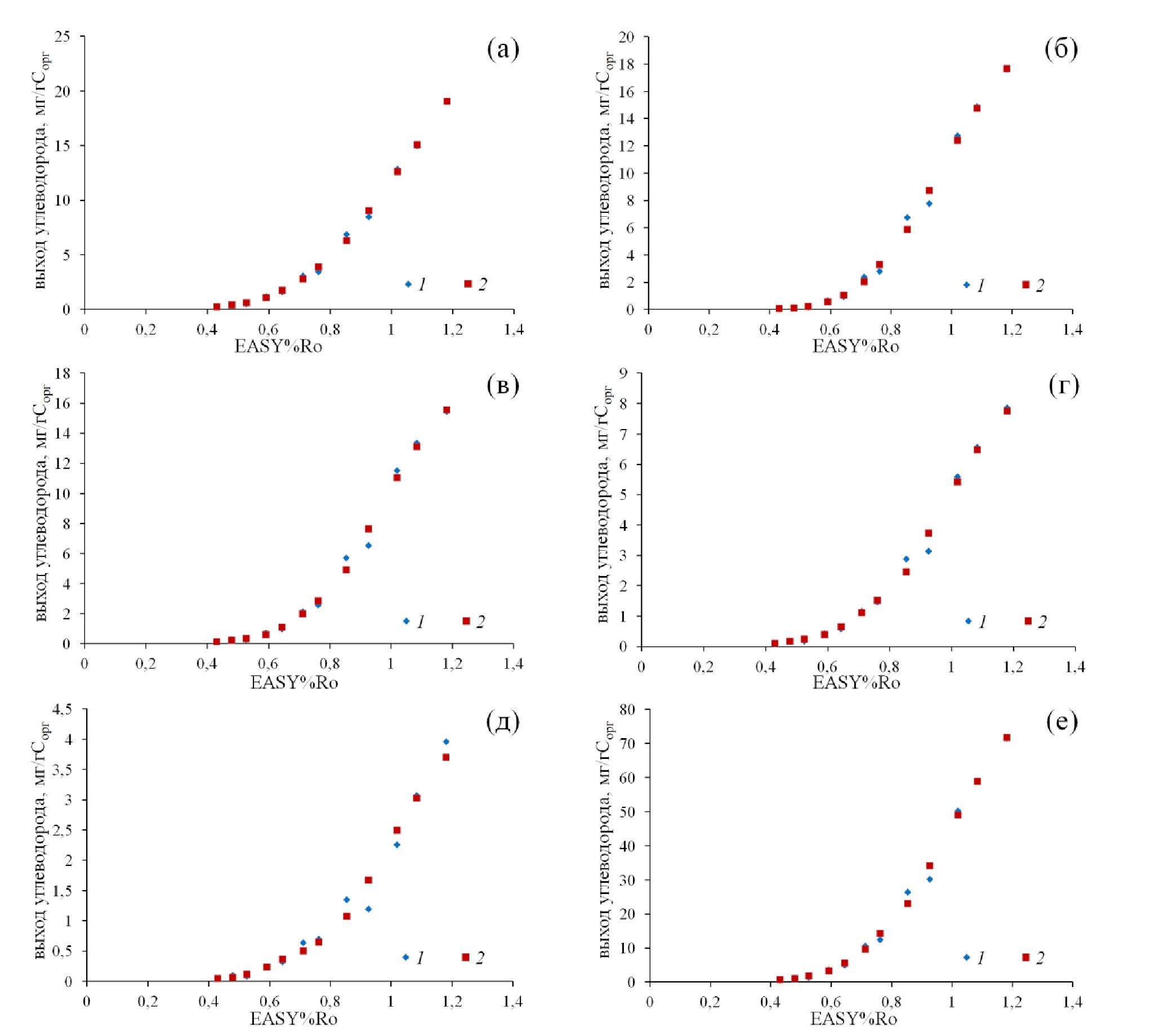 Рис. 3. Сопоставление экспериментальных данных и результатов расчета выходов углеводородных газов при гидротермальном воздействии в соответствии с распределением энергий активации на рис. 2. Где а-е: а — метан, б — этан, в – пропан + пропилен, г — н-бутан, д — н-пентан, е — сумма предельных и непредельных газов состава С1-С5 без пентенов. 1 — экспериментальные данные, 2 — результаты расчета