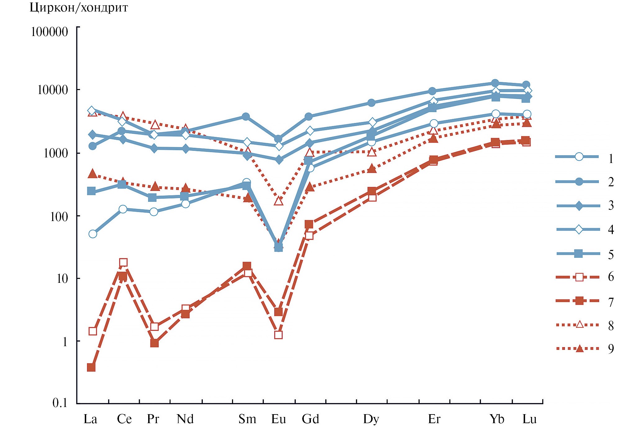 Схожие особенности состава (обогащение несовместимыми элементами и выполаживание спектров распределения REE за счет увеличения содержания LREE) будут наблюдаться как у циркона, перекристаллизованного под воздействием флюидонасыщенного магматического расплава (Putnis, 2002), так и испытавшего воздействие гидротермальных растворов в более низкотемпературных условиях, вплоть до образования кор выветривания (Balan et al., 2001; Скублов, Золотарева, 2012). Объединяет эти достаточно контрастные геологические процессы то, что в многочисленных примерах речь идет о перекристаллизации того или иного исходного циркона, который определяется как неизмененный (как правило, он имеет черты типичного циркона магматического происхождения). Достоверно установленные примеры кристаллизации циркона непосредственно из гидротермального флюида более редки (Zhai et al., 2022).