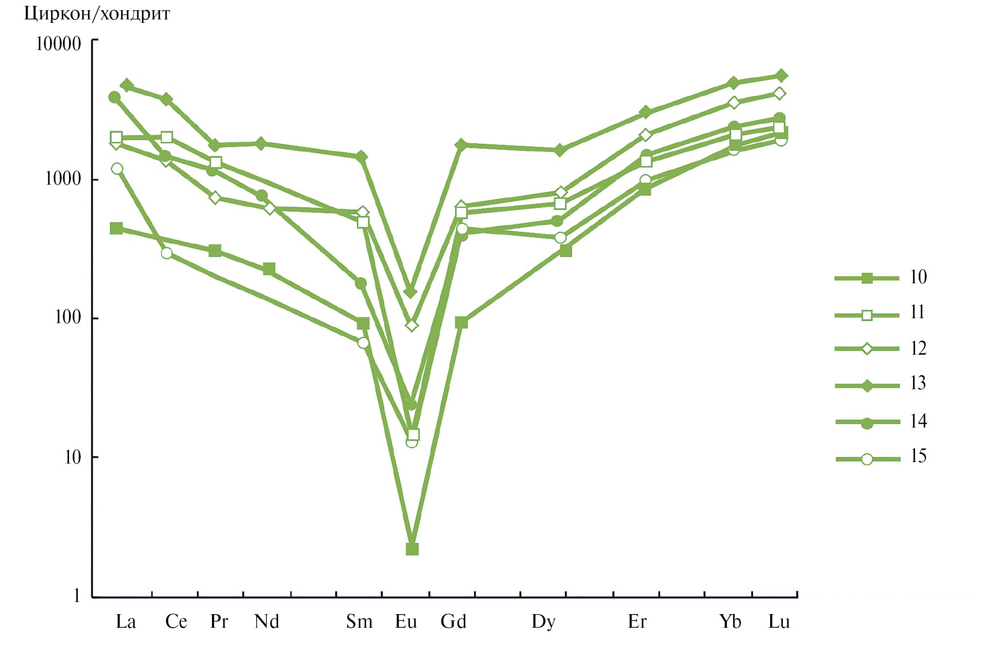 Суммарное содержание REE в цирконе из всех трех групп пород (выборгитов второй фазы, аплитовидных гранитов контактовой зоны и трахитоидных гранитов третьей фазы) в целом сопоставимо и составляет первые тысячи ppm. Отметим, что минимальное содержание (менее 500 ppm) REE встречено в некоторых точках циркона из зоны контакта, а максимальное (более 3000–5000 ppm) – в цирконах из гранитов второй фазы.