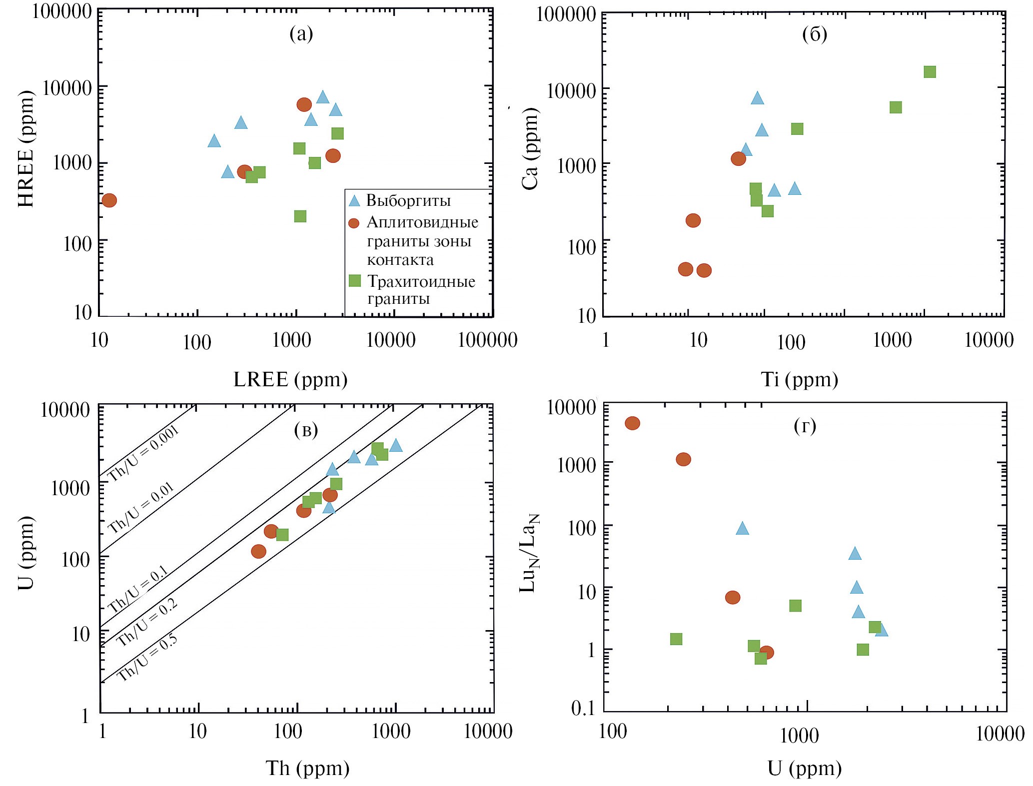 Рис. 5. Диаграммы LREE–HREE (а), Ti–Ca (б), Th–U (в) и U–LuN/LaN (г) для циркона из выборгитов, аплитовидных гранитов зоны их контакта и трахитоидных гранитов.