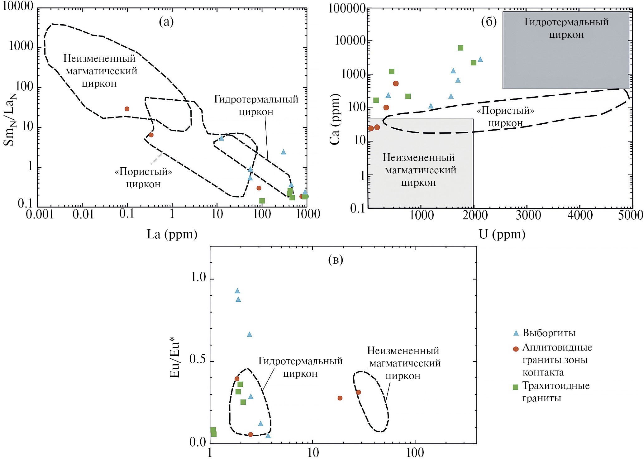 На диаграмме La–SmN/LaN (рис. 6а), характеризующей степень фракционирования LREE (Hoskin, 2005), бóльшая часть точек циркона из всех трех типов гранитов тяготеет к области «гидротермального» циркона. Две точки циркона из зоны контакта расположены обособлено в пределах и вблизи поля неизмененного магматического циркона.