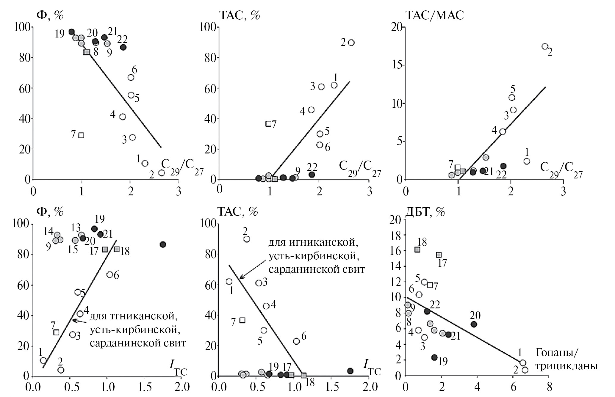 Возможно, эта зависимость является генетической, и концентрации ТАС растут параллельно с концентрациями стеранов С29, которые встречены в обилии в докембрийских образованиях (Петров, 1984, 1994; Конторович и др., 1999). Однако зависимость создают в основном БОП сарданинской свиты, не исключено накопление ТАС и стеранов С29 за счет миграционных процессов накопления и рассеивания УВ. Эти же причины могут создавать зависимости между концентрациями Ф, ТАС и ITC в трицикланах. Обратная связь концентраций ДБТ и отношения гопанов С27–35 к трицикланам С19–31, вероятно, обязана отличию сарданинских слабо зрелых битумоидов №№ 1 и 2.