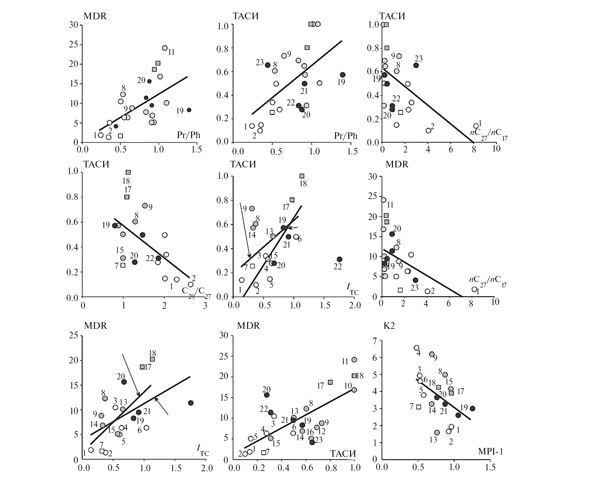 Между катагенетическими параметрами ароматической фракции ТАСИ = (TASC20 + TASC21)/ТАС и MDR = 4MDBT/MDBT отмечается прямая зависимость (рис. 9), а с MPI-1 = 1.5(2MP + 3MP)/(P + 1MP + 9MP) и стерановым коэффициентом зрелости К2 они не коррелируют. Параметры MPI-1 и К2 обнаруживают обратную связь, причина не ясна. Битумоиды игниканской и нерюенской свит могут находиться на стадии инверсии стеранового коэффициента (Brocks et al., 2003 и др.), судя по высоким MDR. Корреляция ТАСИ и MDR с генетическими параметрами насыщенной фракции (рис. 9) отражает, вероятно, катагенез – с ростом термической преобразованности увеличивается трициклановый индекс и уменьшаются концентрации стерана С29 по сравнению с С27.