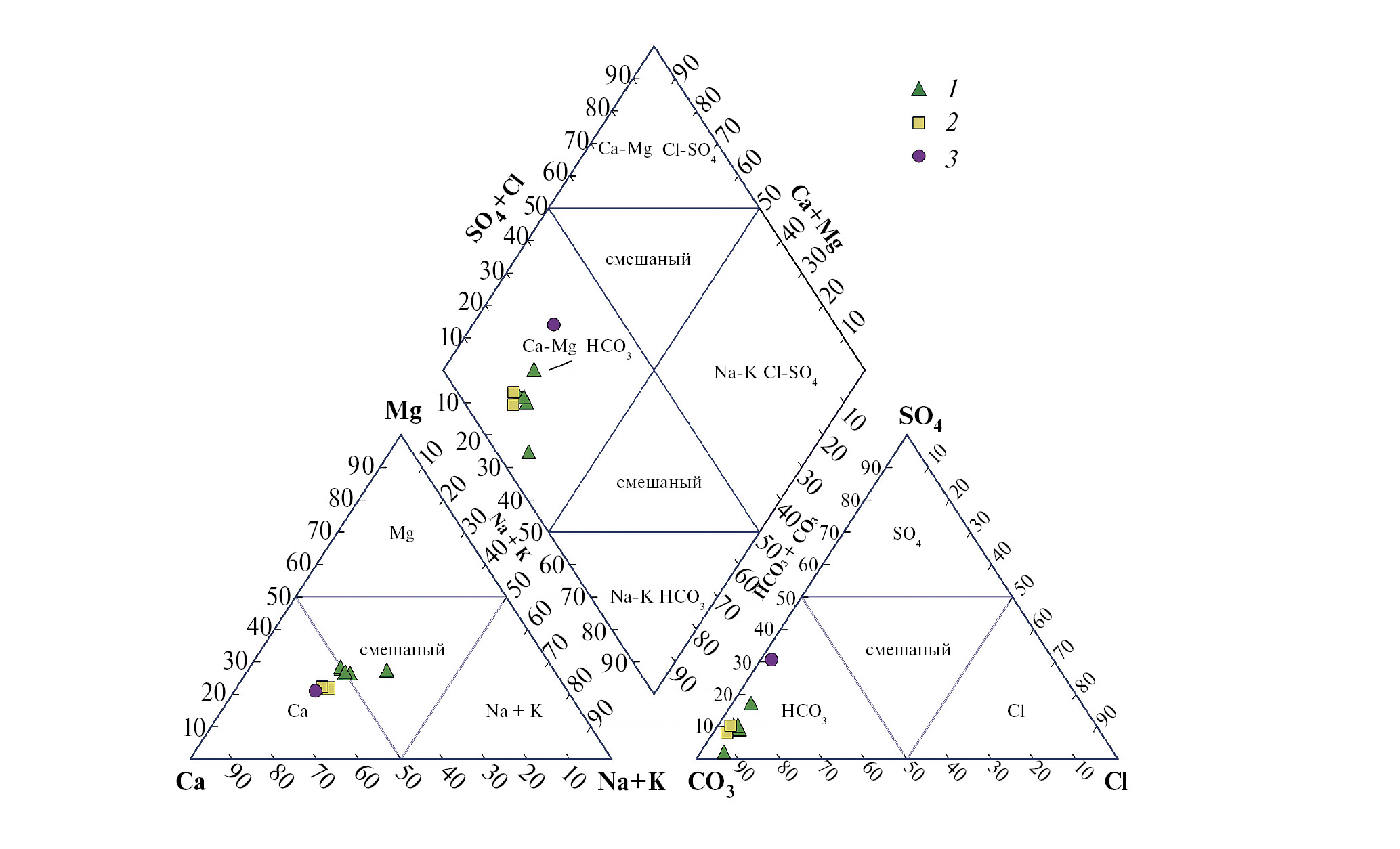 Рис. 5. Диаграмма Пайпера с нанесением данных по природным водам исторического рудника Гербертц. Показаны данные для шахтных стволов: 1 – Гербертц I восточный, 2 – Гербертц I западный, 3 – Гербертц II.