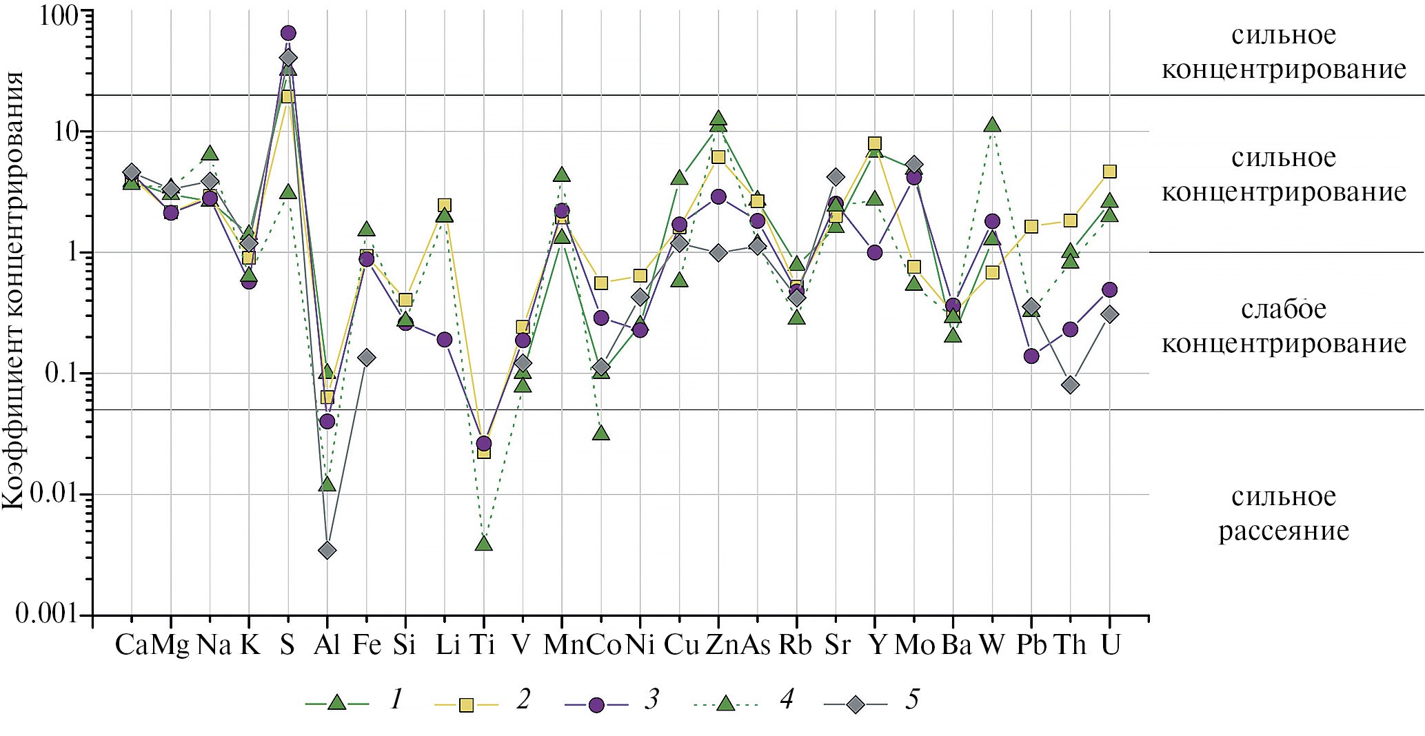 Рис. 6. Коэффициенты концентрирования некоторых элементов в водах исторического рудника «Гербертц». Показаны данные для: 1 – П2, 2 – 22-01, 3 – 22-03, 4 – 23-64, 5 – геохимический фон (Государственная…, 2007).