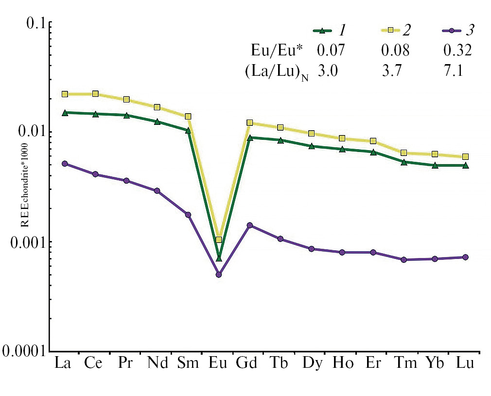 Рис. 7. Распределение РЗЭ в природных водах рудника «Гербертц». Показаны данные для: 1 – Гербертц I восточный (среднее по данным 2021–2023 гг.), 2 – Гербертц I западный (среднее по данным 2022 г.), 3 – Гербертц II (2022 г.).