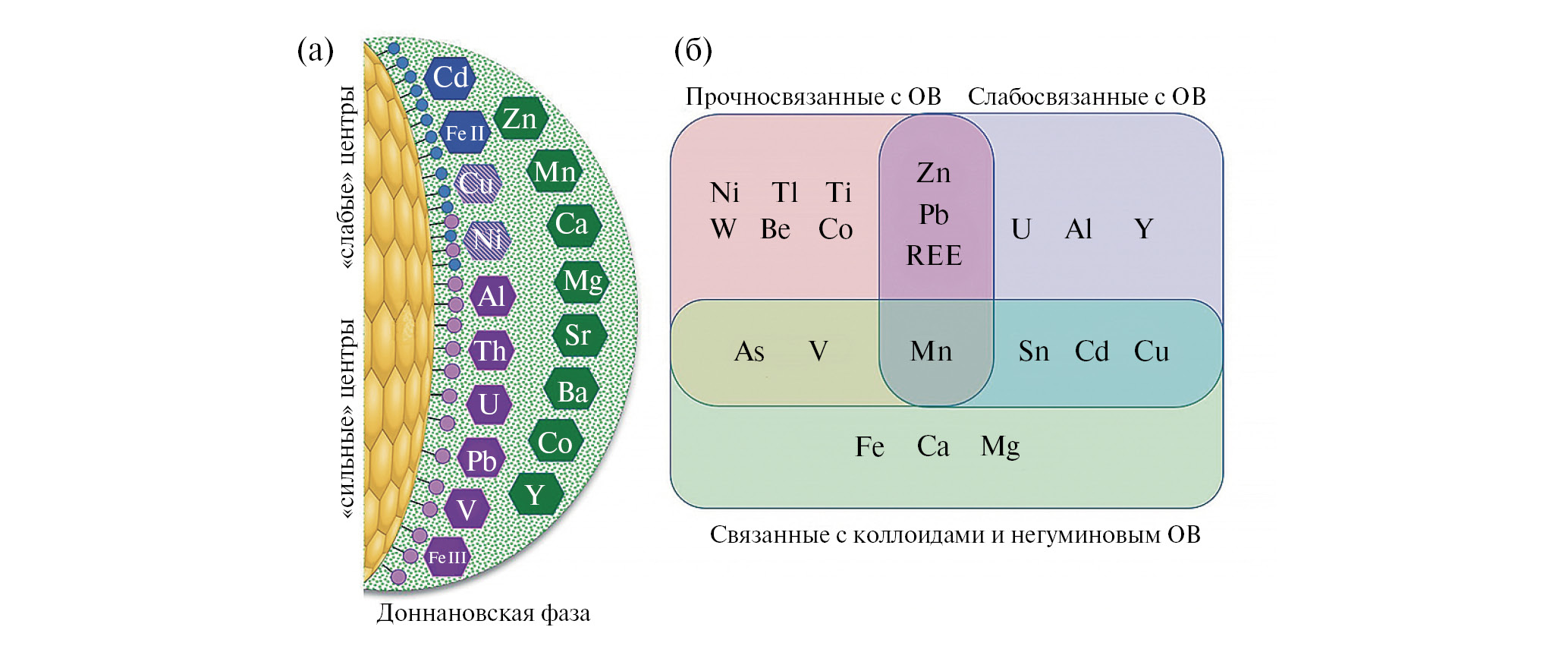 Для количественной оценки распределения форм нахождения металлов, связанных с растворенным ОВ, детально описана на большом экспериментальном материале модель неидеальной конкурентной адсорбции (NICA), дополненная моделью Donnan для учета неспецифичных (электростатических) взаимодействий (Kinniburgh et al., 1999). В модели предполагается, что доминирующую роль в комплексообразовании играют кислотные группы, а химическая гетерогенность ОВ может быть описана с помощью ряда специфических констант сродства к протону. Данная модель предполагает учет суммы бимодального распределения центров связывания, которые условно разделены на типы центров с высоким и низким сродством к протону. Учитывая особенности состава функциональных групп гуминовых веществ, к высокоспецифичным («сильным») центрам относят фенольные группы, а к низкоспецифичным – карбоксильные. Такое обозначение прижилось в литературе несмотря на то, что в бимодальном распределении они перекрываются и фенольные и карбоксильные радикалы могут выступать в качестве и сильных и слабых центров связывания (Koоpal et al., 2005, 2020).