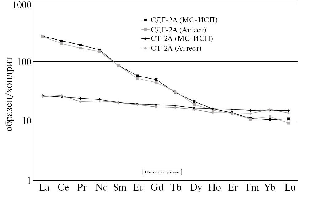 Для двух стандартных образцов, выпущенных в 2005 году – СГД-2А и СТ-2А – полученные нами результаты по большинству элементов соответствуют аттестованным значениям в пределах представленного доверительного интервала (табл. 4). Ориентировочное значение для Tm – 0.35 мкг/г в СГД-2А подтверждается методом МС-ИСП – 0.36 ± 0.02. Нормированное на хондрит (Sun, McDonough, 1989) распределение РЗЭ, представленное на рис. 1, также свидетельствует о хорошем совпадении полученных результатов и аттестованных значений.