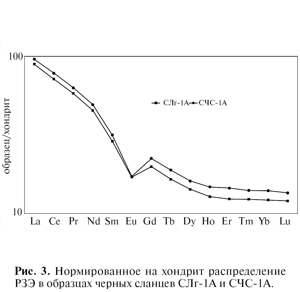 Рис. 3. Нормированное на хондрит распределение РЗЭ в образцах черных сланцев СЛг-1А и СЧС-1А.