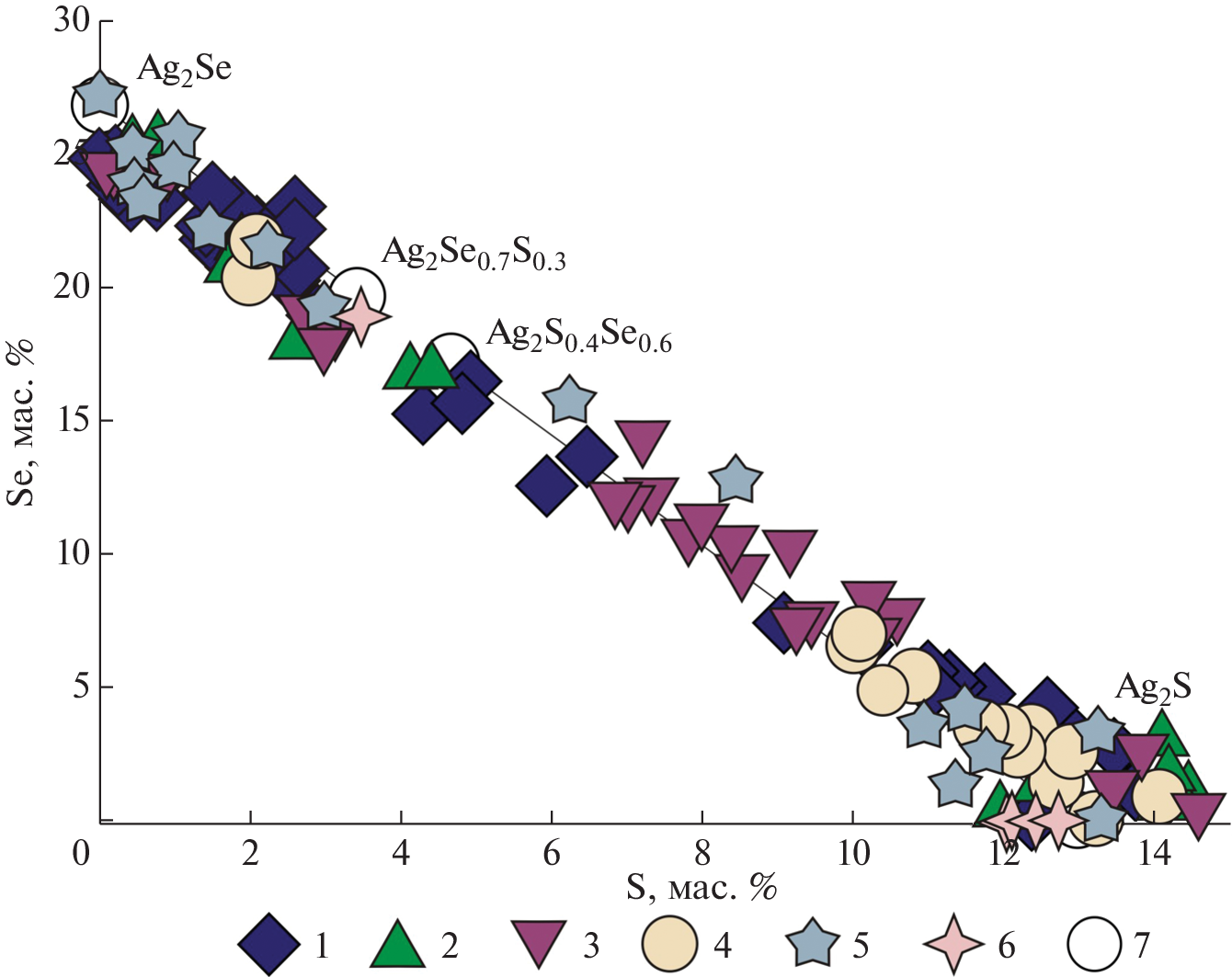 - Seryotkin Y.V., Palyanova G.A., Kokh K.A. Sulfur-selenium isomorphous substitution and polymorphism in the Ag2(Se,S) series // J. Alloys and Compounds. 2015. V. 639. P. 89–93.