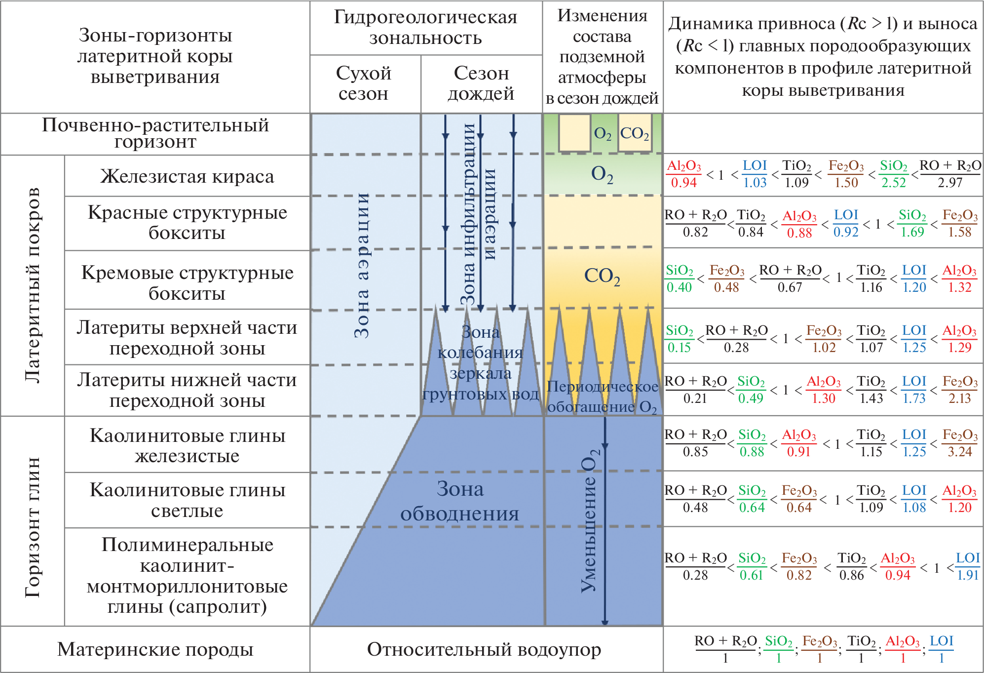 Результаты детальных разведочных работ и круглогодичных наблюдений за гидрогеологическим режимом на крупных месторождениях, а также специальных гидрохимических исследований различных типов вод и изменений газового состава подземной атмосферы в латеритной коре выветривания крупнейшей бокситоносной провинции ФДМ, благодаря надежной фактической базе, позволили впервые сделать ряд важных выводов об условиях и особенностях формирования зональности в латеритном профиле выветривания. Профиль выветривания состоит из двух пространственно совмещенных в плане, но раздельных по вертикали метасоматических колонок: верхней, собственно латеритного покрова, сложенного в основном продуктами конечного гидролиза латеритного выветривания, т.е. гидроксидами и оксидами железа и алюминия; нижней, сложенной глинистым элювием, продуктами гидратирования и разложения алюмосиликатов – полиминеральными глинами и каолинитом. В обеих колонках процессы изменения начинаются с воздействия одних и тех же дождевых вод, но отличаются гидродинамическими параметрами в каждой из колонок. Изменения в профиле выветривания происходят в соответствии с главными закономерностями низкотемпературного инфильтрационного метасоматоза. Современный гидрогеологический и газовый режим в бокситоносных латеритных покровах контролирует минералого-геохимическую зональность. Особенности биолого-почвенных процессов, гидродинамики и гидрохимии в профиле выветривания приводят к пороговому характеру смены физико-химических и биохимических условий, обеспечивая действие геохимических (окислительных, восстановительных, глеевых, адсорбционных) барьеров – главного механизма зонального распределения вещества в латеритных корах выветривания.