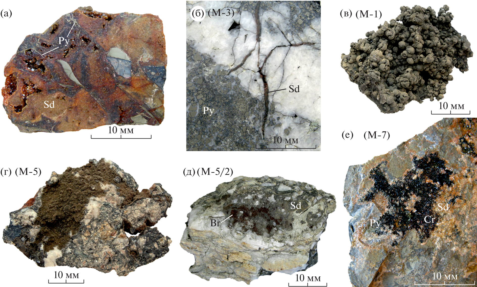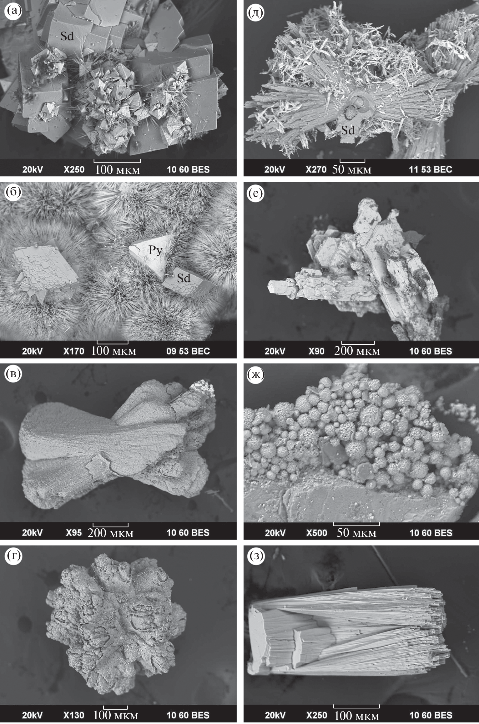 The mineral association of siderite with Cu–Fe sulfides, cronstedtite, and goethite were first recognized when studying the Mikheevskoe Cu(Mo,Au)–porphyry deposit. This association is confined to fault zones, where it fills a network of mineralized fractures developed on porphyry- and argillizite-type ores. Minerals of this association were also identified in some argillizite samples of this deposit. The formation conditions of this mineral association and its relation to the evolution of the Late Paleozoic porphyry system or other endogenic–exogenic processes manifested during the subsequent geological history of the study area were studied. The integrated research included microprobe analysis and the measurement of O and C stable isotopes in minerals of the studied association in the “Geoanalitik” (Yekaterinburg) and “Geonauka” (Syktyvkar) Centers for Collective Use. The study of mineral compositions and their relationships indicates that the studied mineral association deposited at temperature of about 70° C from neutral or low-acid solutions HS–,13C with varying HS–, and aSiO2 (aq) contents. The measurements of .13C (from –5.5 to –18.2‰) and 18O (from 20.4 to 33.4‰) values in siderite made it possible to calculate the composition of a mineral-forming fluid. It was established that such a fluid has the following parameters: .18O H2O from –3 to +10‰ and 13C CO2 from 15 to –28‰. It could correspond to magmatogenic water fluids mixed with Corg-bearing surface water. Based on the obtained results, it is suggested that this mineral association is related to argillizites, the development of which occurred at the last stage of endogenic mineral formation at the Mikheevskoe deposit. Nevertheless, it is not excluded that it may be related with other low-T hydrothermal processes at the stage of Meso-Cenozoic tectonomagmatic activation of the Urals. There is no evidence of the relation of the studied mineral association with weathering crusts