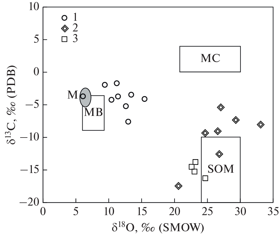 - Zhang C.L., Horita J., Cole D.R., Zhou J., Lovley D.R., Phelps T.J. Temperature-dependent oxygen and carbone isotope fractionation of biogenic siderite // Geochim. Cosmochim. Acta 2001. V. 65. P. 2257–2271. https://doi.org/10.1016/S0016-7037(01)00596-8