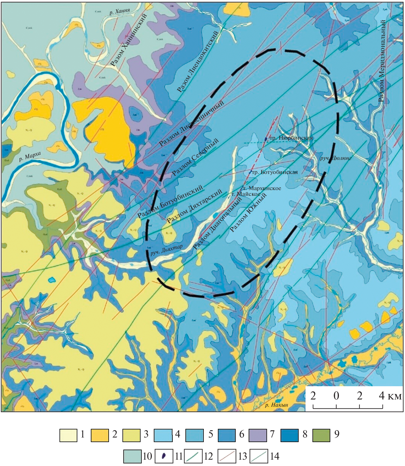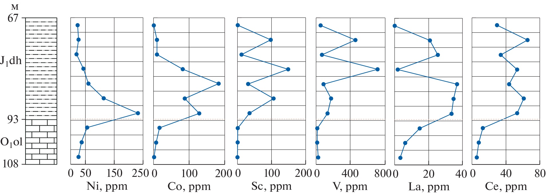 In the Malo-Botuobinsky, Sredne-Markhinsky, and Ygyattinsky diamond-bearing areas of the Western Yakutian kimberlite province, the prerequisites and signs of scandium deposits in ancient weathering crusts overlying Lower Paleozoic rocks and associated with zones of ancient reservoir and soil oxidation. According to X-ray fluorescence and ICP MS analyses, in the Nakyn kimberlite field of the Sredne-Markhinsky diamond-bearing region, promising ore occurrences and scandium concentration halos have been established in clay deposits of redeposited weathering crusts of the Dyakhtar Formation of Late Triassic–Early Jurassic age. They are confined to the erosional surface of Lower Paleozoic carbonate rocks and Middle Paleozoic traps, with monzonite porphyries and kimberlites cutting through them, covered on top by a sedimentary cover of Jurassic terrigenous deposits. Concentration anomalies of scandium in clays of the Dyakhtar Formation are localized mainly in deluvial clay deposits of paleowatersheds and gravitate to the intersections of tectonic disturbances. The depth of their occurrence does not exceed 100 m, which is quite favorable for the extraction of scandium by borehole in situ leaching. Concentrations of scandium were detected at one of the sites before 262 g/t in Late Triassic weathering crust, including material from a Middle Paleozoic gabbro dike, as well as overlying colluvial clays of the Dyakhtar formations with a maximum of 462 g/t.