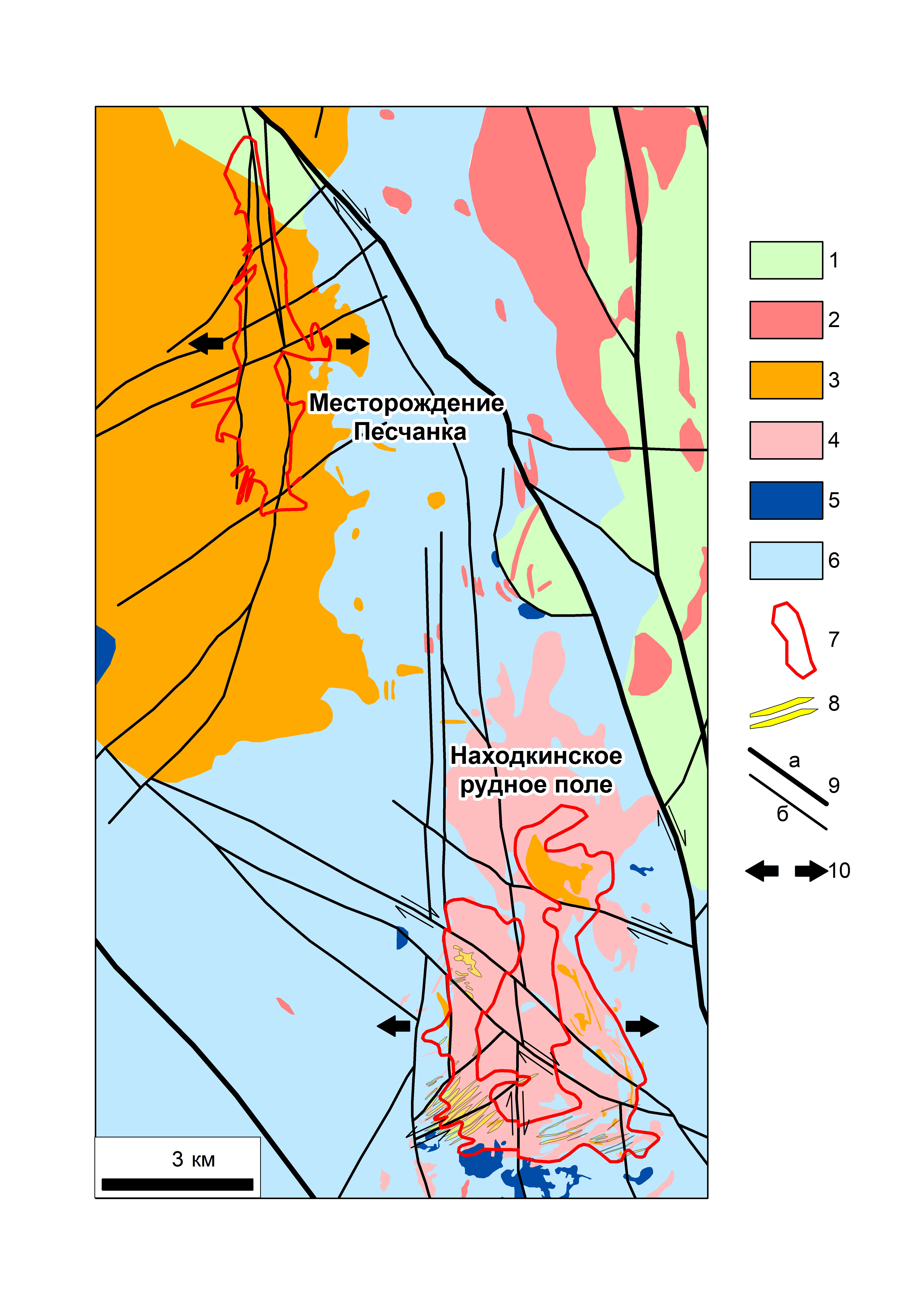 Золото-молибден-медно-порфировое месторождение Песчанка представляет собой линейный полихронный штокверк протяженностью 7 км и шириной до 1 км, разобщенный на 3 части (Главный, Центральный и Северный штокверки) пострудными сбросо-сдвигами. Минеральные ресурсы JORC Песчанки (после завершения детальной разведки месторождения в 2017 г.) составили 9.9 млн тонн меди при среднем содержании 0.39% и 16.6 млн унций (516 т) золота при среднем содержании 0.21 г/т (https://www.kazminerals.com). Месторождение Песчанка по запасам сопоставимо с недавно выявленным в Хабаровском Крае крупным золото-медно-порфировым месторождением Малмыж (балансовые запасы 8.3 млн т, золота 347.4 т, https://www.rosnedra.gov.ru/), расположенным в зоне динамического влияния Центрально-Сихоте-Алинского сдвига (Читалин и др., 20132; Soloviev et al., 2019; Читалин, 2021; Петров и др., 2023).