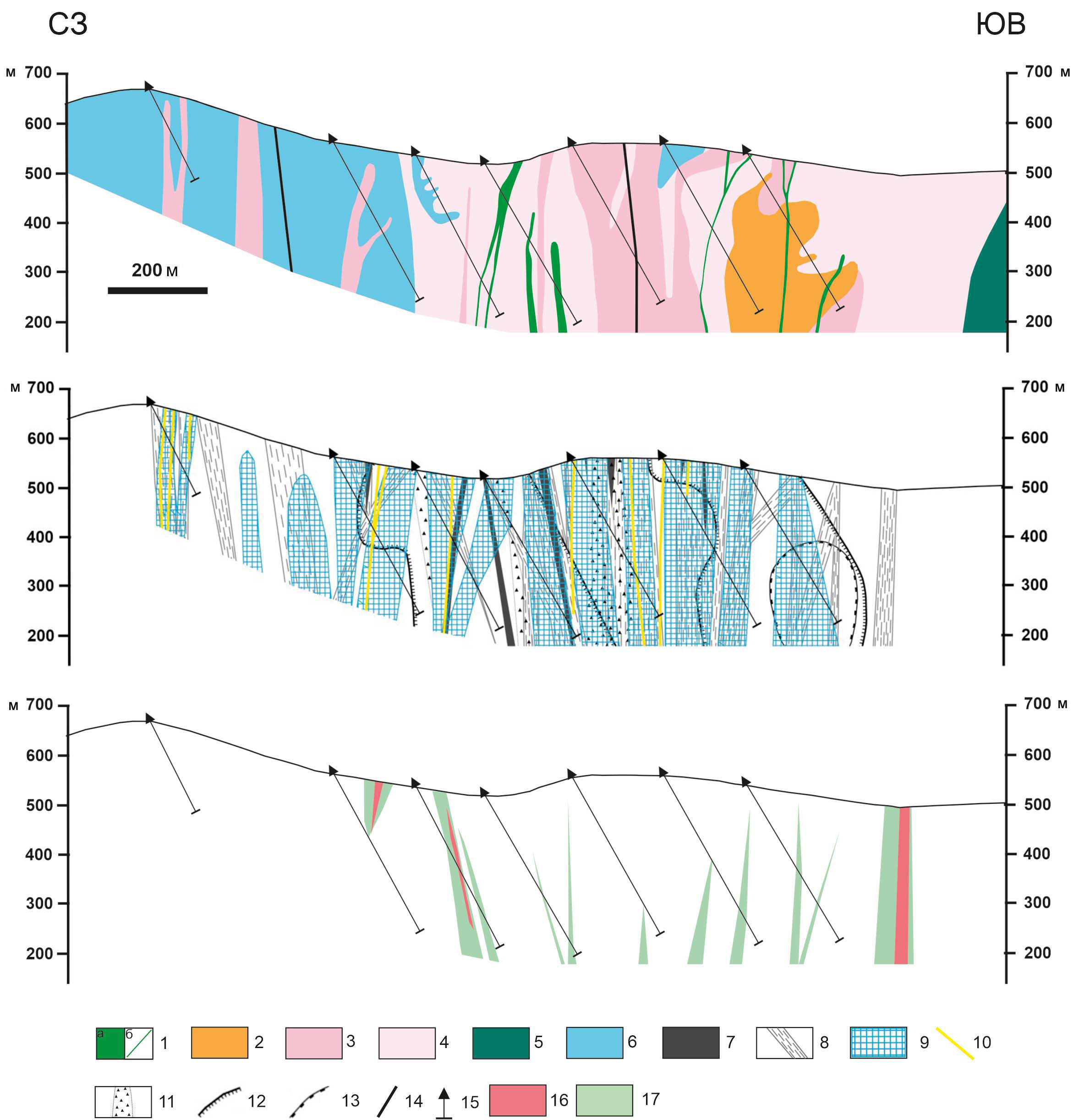 Рудный штокверк (прожилково-вкрапленная кварц-сульфидная минерализация) сформировался по метасоматически измененным монцодиоритам первой фазы и монцодиорит-порфирам второй фазы (Марущенко и др., 2015; Chitalin et al., 2021, фиг. 4). Рудные тела имеют форму мощных пластин крутого западного и восточного падения, которые на отдельных разрезах смыкаются в виде арки в осевой части месторождения. Ниже зоны окисления (30–150 м) и внутри нее выделяется слабо проявленная зона вторичного сульфидного обогащения (халькозин, ковеллин).
